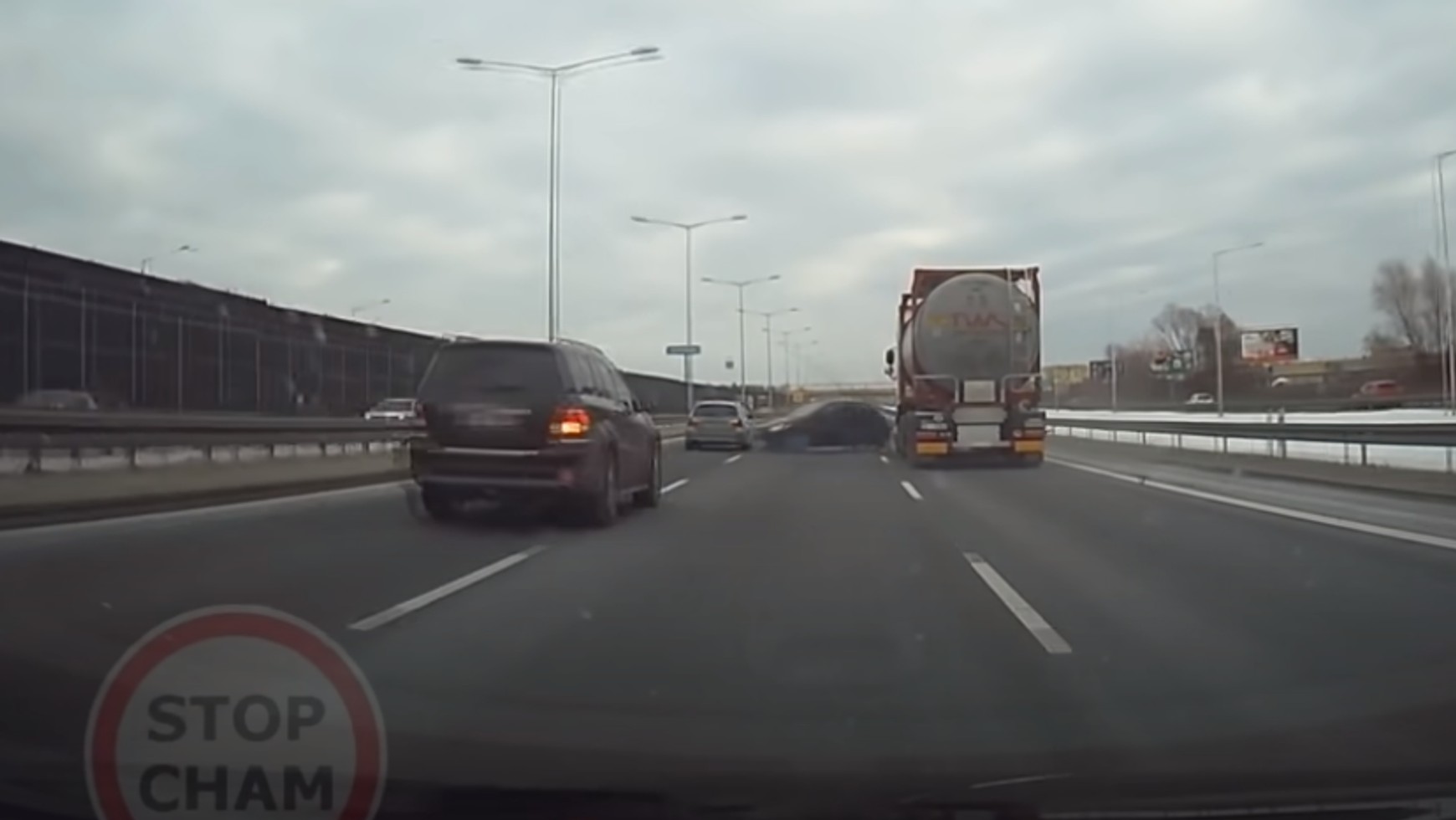 I tak też zapewne było w tym przypadku. Kierowca cysterny zaczął wyprzedzać samochód osobowy, który jechał wolniej. Auta znajdowały się w okolicach węzła, może kierowca myślał, że osobówka zwalnia, bo będzie zjeżdżać? Ale to, co dzieje się potem jest już dziwne, bo auto osobowe, które jeszcze przed chwilą jechało wolniej od cysterny, jakby zaczyna przyspieszać, co zresztą widać. Bo w początkowym etapie wyprzedzania ciężarówka jest szybsza, ale już po chwili osobówka jedzie w martwym polu auta ciężarowego. Efekt nie jest trudny do przewidzenia i raczej typowy dla takich zdarzeń drogowych – wybite z toru jazdy auto osobowe porusza się po drodze w przypadkowy sposób, a ciężarówka – też się zatrzymuje – ale po kilkuset metrach.