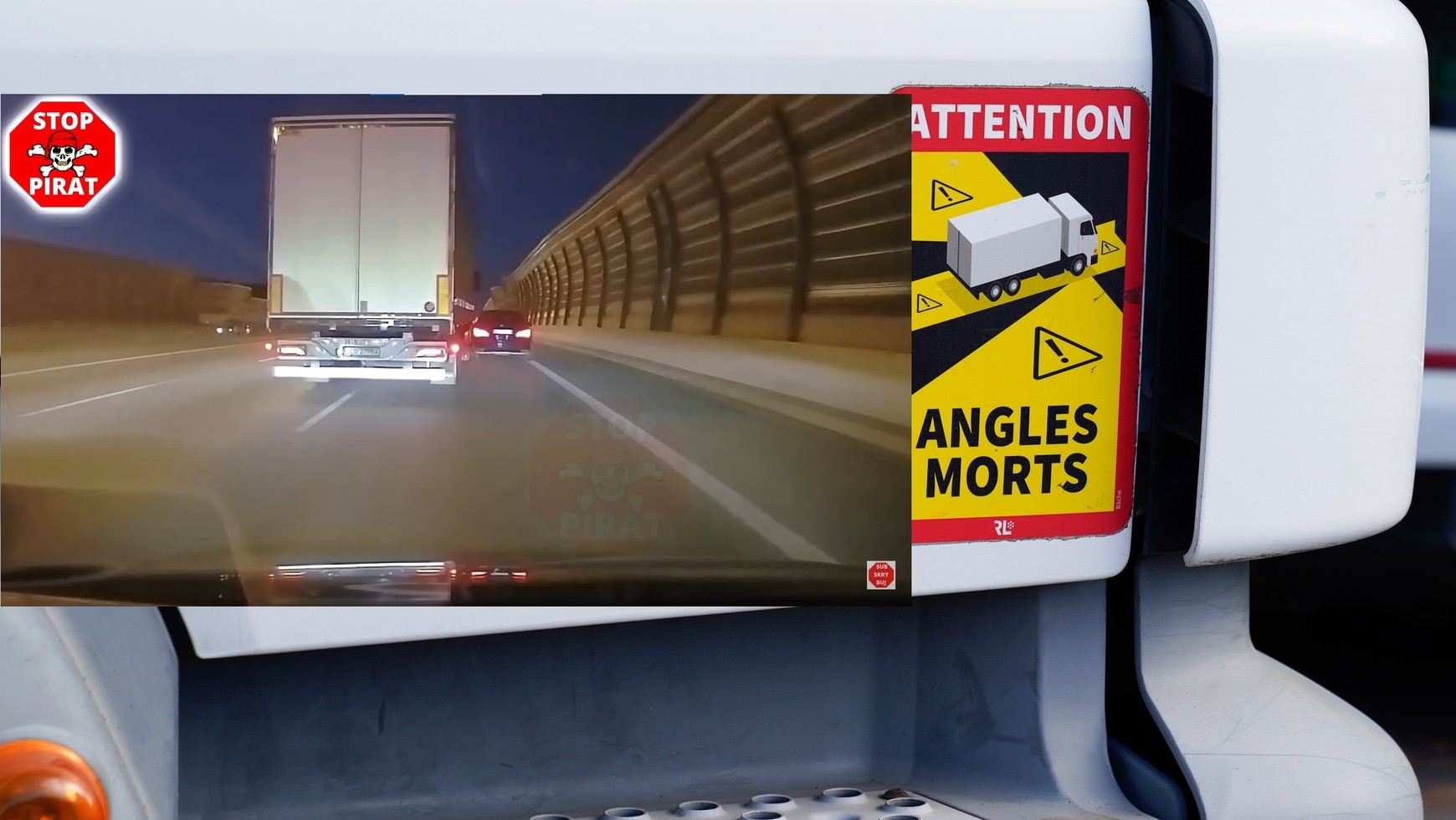 Takie usytuowanie osobówki sprawia, że kierowca ciągnika nie widzi go w lusterkach, czyli Mercedes jest w tzw. martwym polu. W momencie, w którym ciężarówka zaczyna zjeżdżać na prawy pas, osobówka zjeżdża do lewej, aby także znaleźć się na prawym pasie. Za chwilę dochodzi do kolizji.