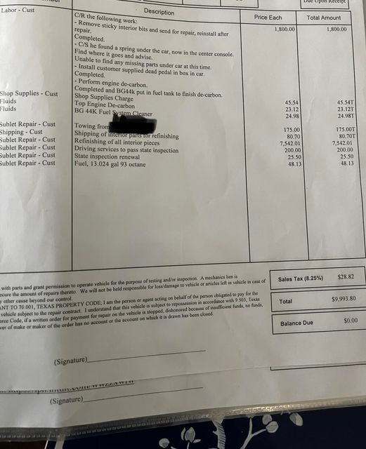 Suma podana jest oczywiście w przybliżeniu. Na rachunku, którym "pochwalił" się w sieci kierowca, ujęta jest także zbiorczo robocizna (1800 dol.), w skład której wszedł także koszt wodorowania (dekarbonizacji) sinika oraz środki do jego przeprowadzenia.