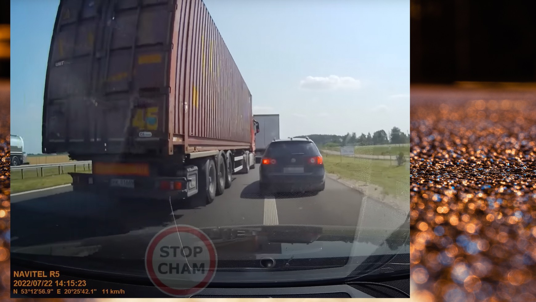 Szesnaście i pół metra długości oraz 40 ton masy własnej — oto dwa podstawowe wymiary dla TIR-ów w Polsce. Dysponując takim kolosem łatwo "znęcać się nad mniejszymi", w tym przypadku osobowymi samochodami. Boleśnie przekonali się o tym bohaterowie tego nagrania, zamieszczonego na popularnym kanale "Stop Cham" na YouTube.