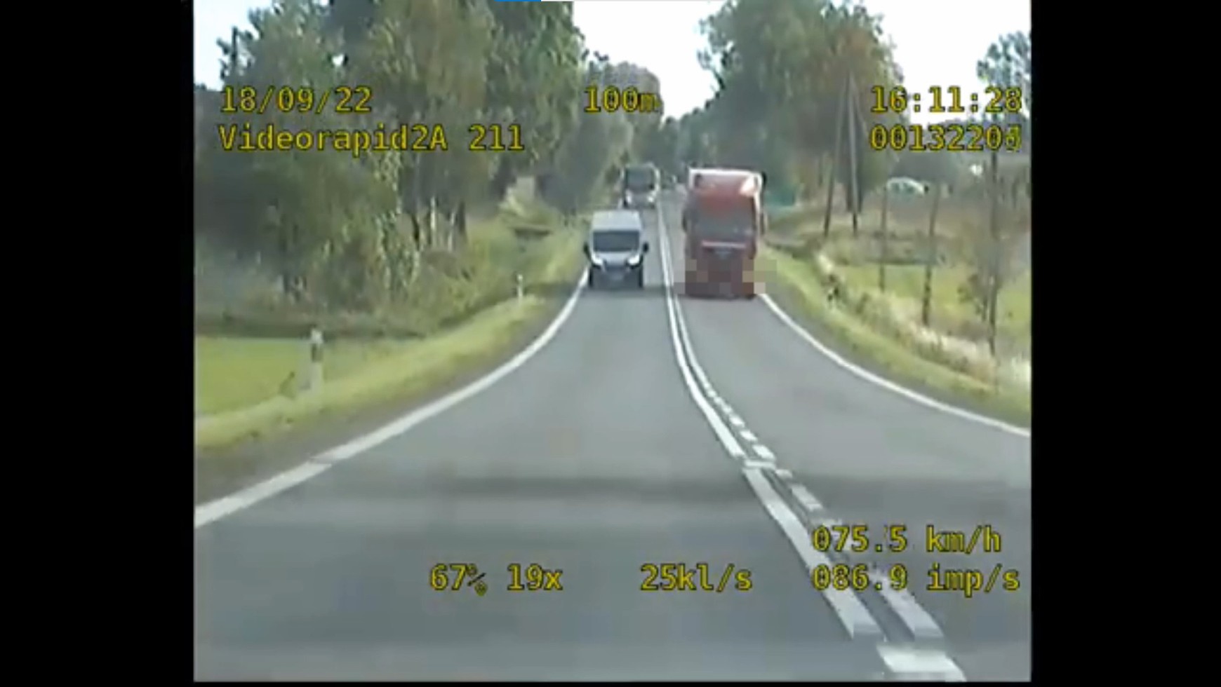 Na drodze krajowej nr 8 w rejonie miejscowości Drygi, tylna kamera nieoznakowanego radiowozu zarejestrowała niebezpieczne zdarzenie z udziałem estońskiego kierowcy TIR-a. Wyprzedzał on busa na skrzyżowaniu i zignorował zakaz wyprzedzania przez pojazdy ciężarowe. Co więcej, robił to pod górę.
