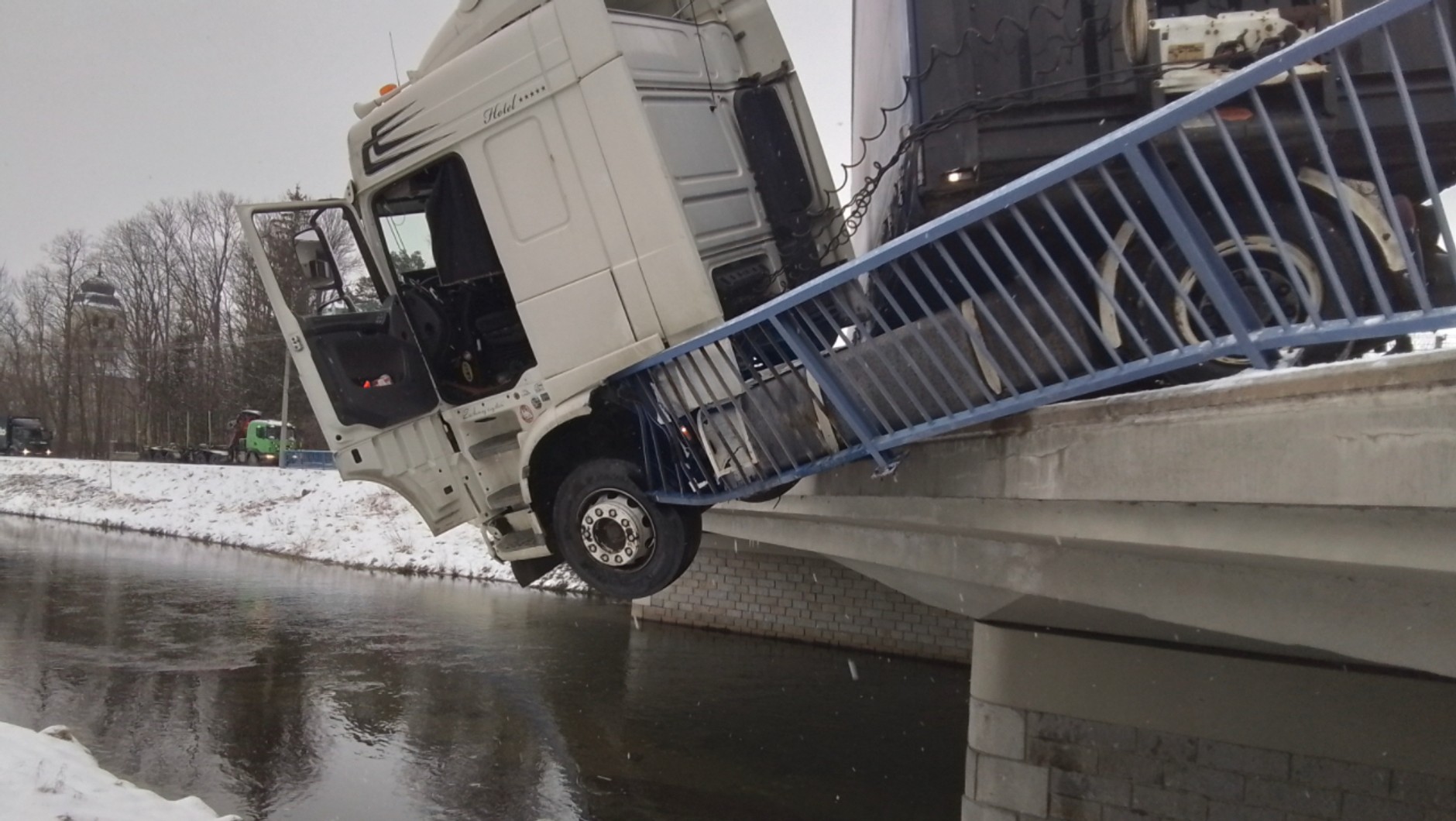 Dalszy ciąg artykułu pod materiałem wideoManewr skończył się dla kierowcy prawie tragicznie. Zestaw wpadł w poślizg. Ciężarówka siłą rozpędu staranowała bariery i prawie spadła z mostu. Polski kierowca miał masę szczęścia — kabina ciężarówki zawisła już nad wodą, ale na miejscu utrzymała ją masa reszty zestawu.