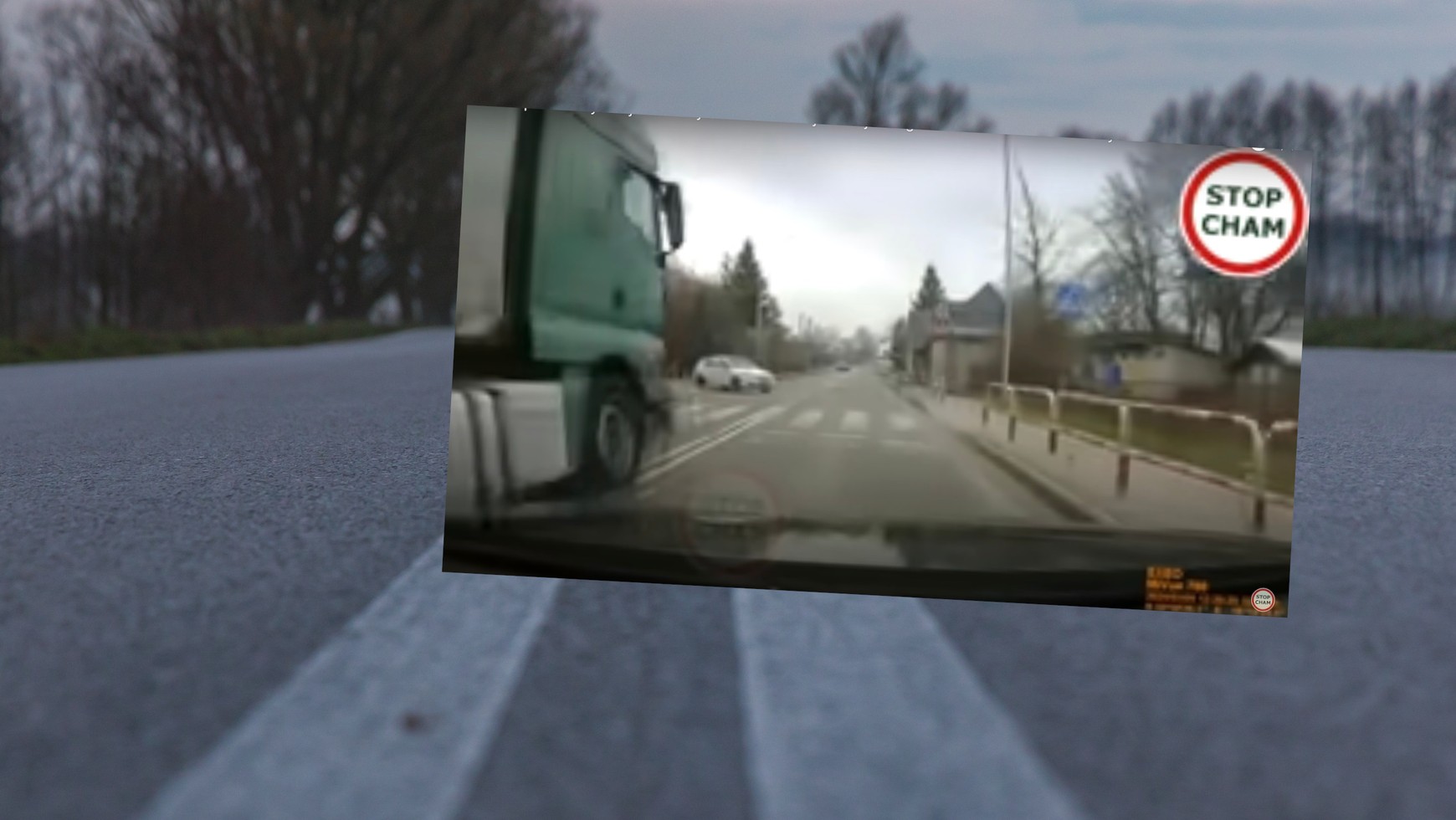 Kierowca auta, w którym znajdował się wideorejestrator, jechał przez obszar zabudowany. Gdy zbliżał się do skrzyżowania, nagle wyprzedziła go ciężarówka. Na skrzyżowaniu, na linii podwójnej ciągłej, na przejściu dla pieszych i w chwili, gdy do ruchu włączało się inne auto wyjeżdżające z ulicy prostopadłej. Prowadzący ciągnik siodłowy z naczepą na szczęście nikogo nie potrącił. Wyprzedził i odjechał.