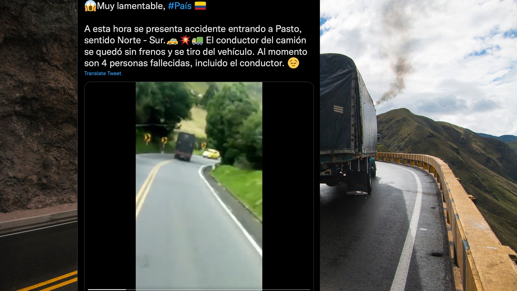 Jak widać na udostępnionym na Twitterze nagraniu, z ciężarówki podczas jazdy wyskakuje kierowca. Z informacji opublikowanych w serwisie El Comercio wynika, że kierujący ciężarowym pojazdem zorientował się, że w aucie doszło do awarii układu hamulcowego i postanowił wyskoczyć przed zakrętem, do którego zbliżał się samochód.