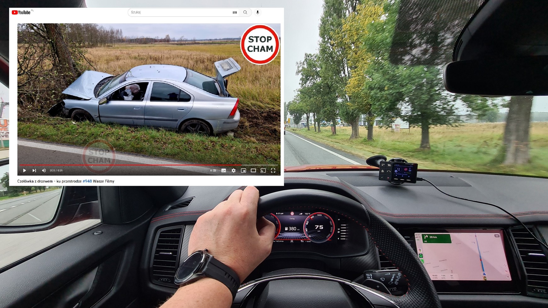 Kierujący sam udostępnił film ze zdarzenia, który opublikowano na popularnym kanale "Stop Cham" na YouTube. W opisie wskazał, iż poruszał się z prędkością 90 km/h poza terenem zabudowanym na drodze pomiędzy Sokolnikami i Orliskami (podkarpackie) i jedynie na chwilę zapatrzył się na radio. Tyle wystarczyło, by auto zjechało na pobocze, a następnie do rowu. Niestety przed przydrożnym drzewem nie udało się już wyhamować.