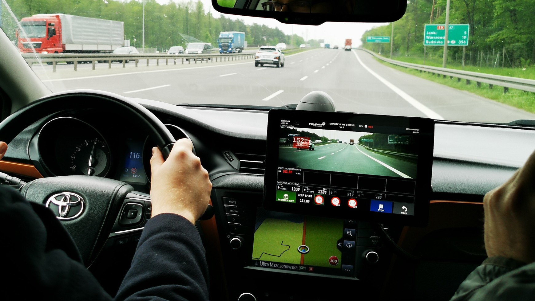 Ruszamy z Raszyna aleją Krakowską w kierunku Janek. Na ekranie zamontowanego tabletu widać obraz z kamery zamontowanej na desce rozdzielczej i oczywiście jadące aleją Krakowską samochody. Przy wszystkich autach znajdujących się w odległości kilkudziesięciu metrów od auta – zarówno tych, które nas wyprzedzają, jak i tych, które my wyprzedzamy, na ekranie tabletu pojawia się czytelna ramka – widać na niej prędkość auta i jego odległość od radiowozu. Dla ułatwienia ramki są albo zielone, albo czerwone – zielona oznacza, że prędkość pojazdu mieści się w ustawionym limicie, czerwona – że auto jedzie za szybko.