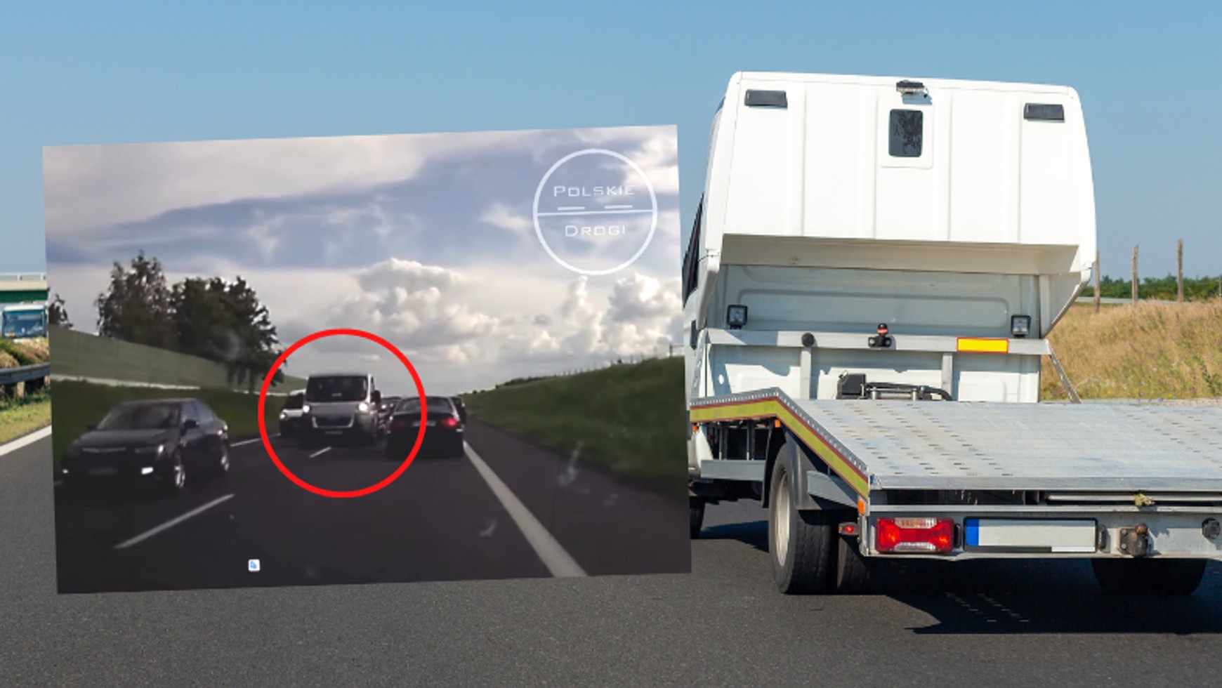 Na opublikowanym przez kanał Polskie Drogi nagraniu widać auta jadące po drodze dwupasmowej (po jednym pasie w każdą stronę). Z jednej strony auta zjeżdżają na pas awaryjny. Zwykle dzieje się tak, gdy środkiem ma przejechać pogotowie ratunkowe, straż pożarna, lub policja, ale tym razem to... laweta. Zwykła laweta marki Citroen i kierowca, któremu najwyraźniej bardzo się spieszyło.