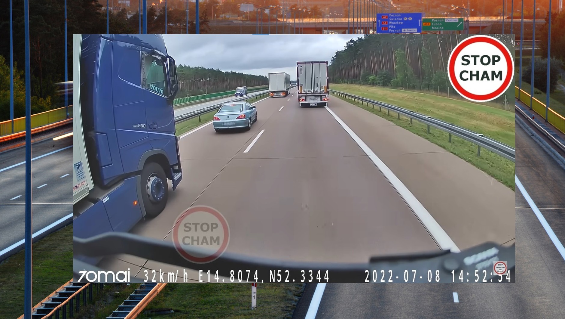 Na nagraniu z kamery umieszczonej w jednym z TIR-ów widzimy, jak jedna z ciężarówek wyprzedza lewym pasem nagrywającego i kolejny zestaw. W pewnym momencie wyłania się niebieski Peugeot, który wyprzedza wszystkie duże pojazdy pasem awaryjnym, po czym zajeżdża drogę ciężarówce na lewym pasie i zaczyna hamować.
