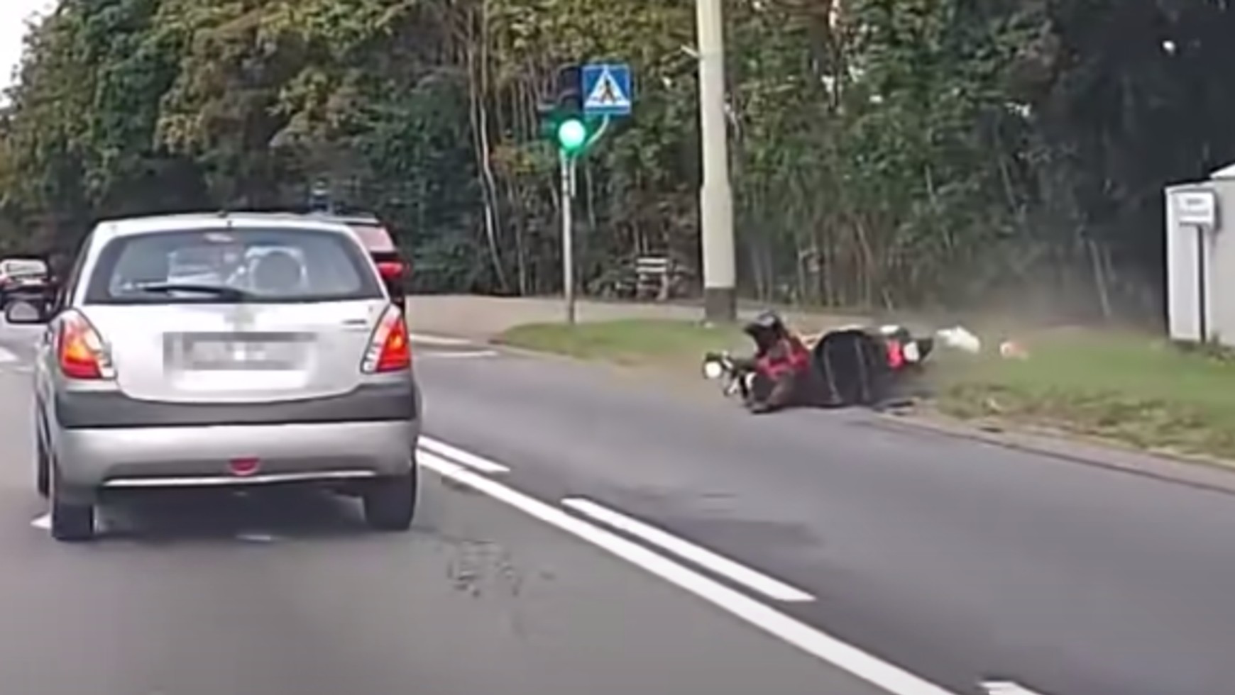 Na filmie widać, jak spokojnie jadący prawym pasem skuter zostaje uderzony i dosłownie zmieciony na pobocze przez dużego SUV-a, jak się okazuje – BMW X5. Jadący skuterem człowiek spada z pojazdu. Na szczęście ma na głowie solidny kask, poza tym ubrany jest też w odpowiedni strój, który zapewne uchronił go przed poważniejszymi urazami. Kierowca BMW, który spowodował ten wypadek, zamiast zatrzymać się, sprawdzić, co się stało i udzielić pomocy, dodał gazu i zaczął uciekać.