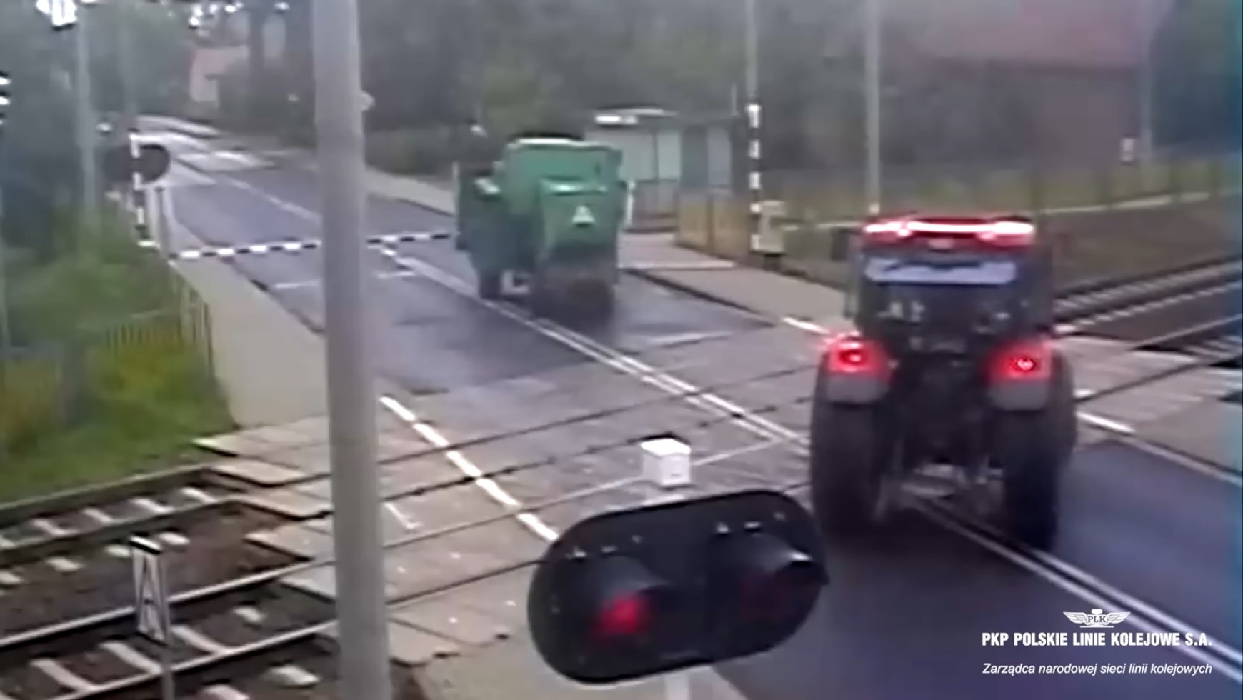 Tym razem film udostępniony przez PKP Linie Kolejowe jest jeszcze bardziej zaskakujący. Przedstawia on dwóch śmiałków w maszynach rolniczych — jedną jest kombajn, a drugą traktor. Oba pojazdy wjechały na przejazd w czasie, gdy szlabany się zamykały. Co ciekawe, śmiałek z kombajnu nie bacząc na nic, przejechał przez przejazd, wyłamując przy okazji jedną z zapór.