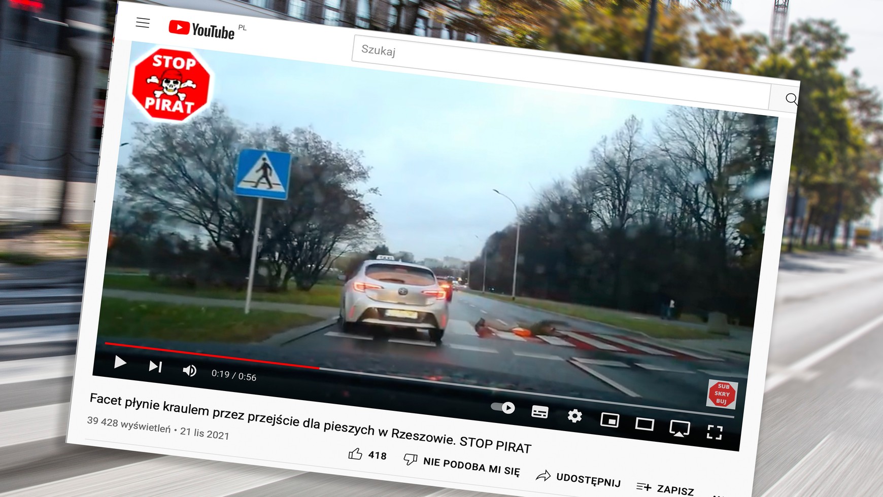 Nie od dziś wiadomo, że życie jest największą kopalnią niespodzianek i każdy nowy dzień może nas czymś zaskoczyć. Jakże ogromne zdziwienie czekało na kierowców w Rzeszowie, którzy 19 listopada br. jechali aleją Witosa. Otóż na jednym ze znajdujących się tam przejść dla pieszych na środku jezdni leżał człowiek, który symulował pływanie kraulem.