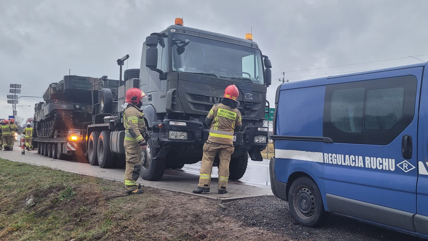 Szczęśliwie w auto nie uderzył sam czołg, lecz Opel Vivaro, którym jechali żołnierze pilotujący lawetę z czołgiem. Niestety, ciężarówka także brała udział w zdarzeniu, a to doprowadziło do sporych zniszczeń i uszczerbku na zdrowiu dwóch osób.