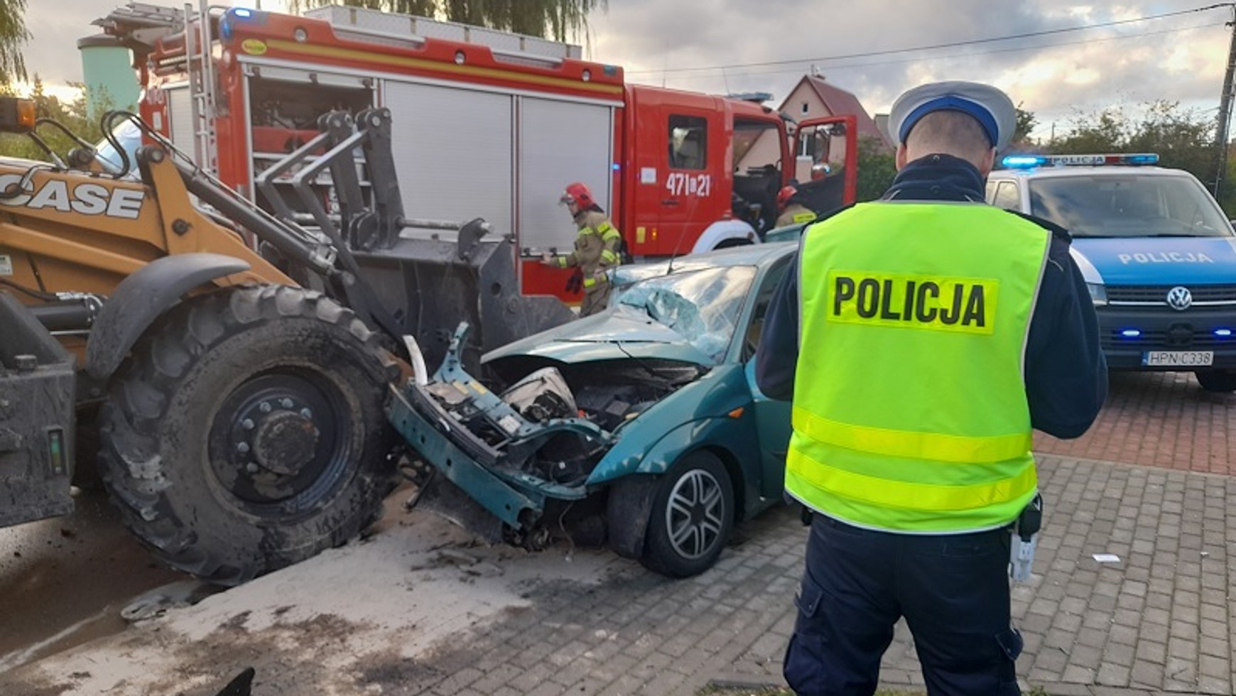 W czwartek 20 października w godzinach porannych funkcjonariusze w trakcie patrolu zwrócili uwagę na kierowcę Forda, który nie miał włączonych świateł i nie używał pasów bezpieczeństwa. Gdy kierowca zauważył, że patrol zawraca, przyspieszył i mimo sygnałów świetlnych i dźwiękowych nie zatrzymywał się do kontroli. W trakcie ucieczki wjechał na rondo niezgodnie z przepisami, gwałtownie ściął zakręt i jadąc lewą stroną jezdni, uderzył w koparkę. Poszkodowanemu 21-letniemu kierowcy oraz 23-letniemu pasażerowi udzielono natychmiastowej pomocy, a następnie przetransportowano do szpitala.