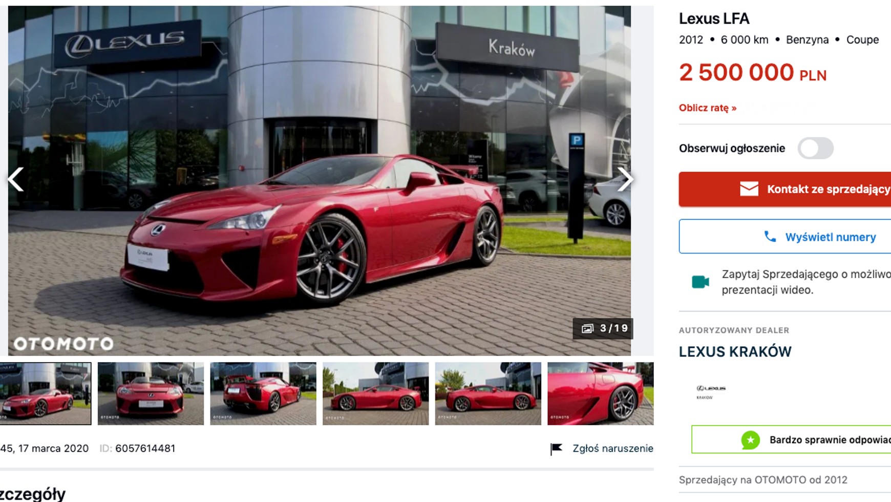 Oferowany przez krakowskiego dilera egzemplarz został skonfigurowany przez polskiego klienta – sam proces zamawiania i dostawy zajął rok. Jak można wyczytać w ogłoszeniu, auto jest jednym z dwóch egzemplarzy, które sprzedano w naszym kraju, a menadżerowie Lexusa potwierdzili, że nie ma drugiej takiej konfiguracji kolorystycznej na świecie: nadwozie w kolorze czerwony metalik, brązowo-beżowe wnętrze z brązową kierownicą i czarną podsufitką, a całość wykończono czerwoną nitką. Właściciel wybrał do samochodu ciemne grafitowe felgi oraz czerwone zaciski hamulcowe. Oferowany w Krakowie Lexus LFA ma 6 tys. km przebiegi, a cena to 2,5 mln zł.