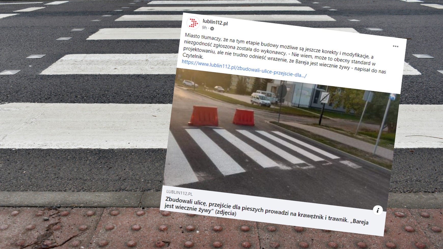 Jeden z czytelników lublin112.pl przesłał do redakcji zdjęcia przejścia dla pieszych znajdującego się na nowo wybudowanym odcinku ul. Wapowskiego w Lublinie. "Zebra" prowadzi na wysoki na krawężnik i trawnik, a nie na chodnik. "Nie wiem, może to obecny standard w projektowaniu, ale nietrudno odnieść wrażenie, że Bareja jest wiecznie żywy" — przekazał zaniepokojony czytelnik.