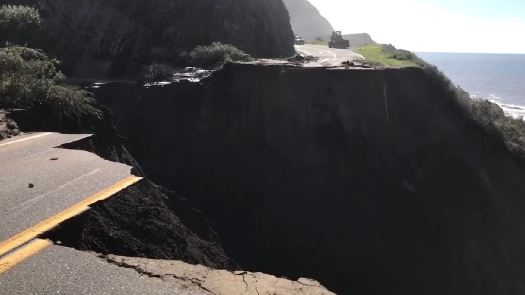 Powodem katastrofy było zasypanie przez spływające z gór kamienie infrastruktury odwadniającej drogę, co doprowadziło do zapadnięcie się autostrady stanowej nr 1, która malowniczo przebiega przez większą cześć wybrzeża stanu Kalifornia. W wyniku osuwiska powstała wyrwa o szerokości 45 metrów.