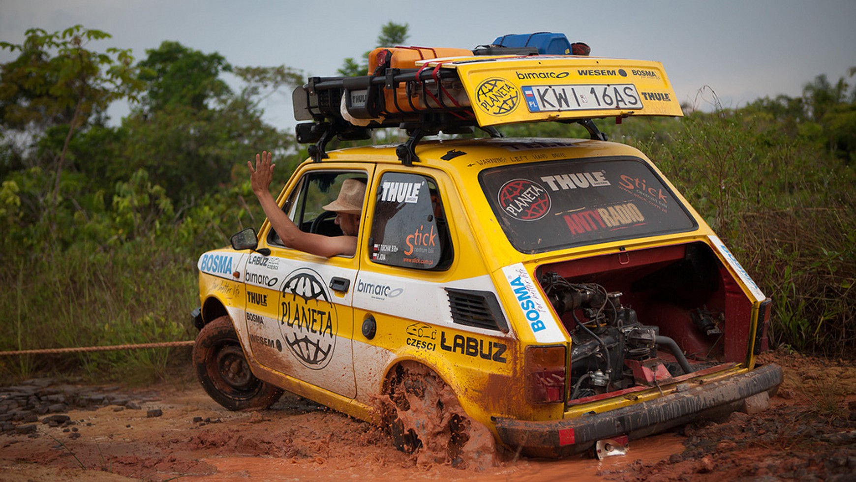 SlowRide w Amazońskiej dżungli! Polski Maluch, dwa dwusuwowe Trabanty czeskiej załogi i "słowacka" Jawa 250 w Amazonii. To brzmi jak żart ale polsko-czesko-slowacka załoga wylądowała w Gujanie, przedarła się przez puszczę słynną Transamazoniką i odlicza kolejne kilometry do końca świata, który wg nich znajduje się na ziemi ognistej w Argentynie. Czeka ją jeszcze wspinaczka na wysokie andyjskie przełęcze w Peru, drift po słonych jeziorach Boliwii, rejs chilijską Panaamericaną i brodzenie w stepach argentyńskiej Patagonii. Ekipa wyprawy składa się również z kamerzystów i fotografów, którzy zbierają materiały do dokumentu o ekspedycji, który pojawi się czeskiej i polskiej wersji językowej. Oto, co przesłał nam prosto z trasy wyprawy jeden z jej polskich uczestników, jadący Fiatem 126p Tomasz Turchan: Legendarna transamazonika, bo o niej tu mowa, oznaczona jest nr BR319 i łączy miasta Manaus i Porto Velhho. Okoliczni mieszkańcy dobrze wiedzą o jej istnieniu lecz niewielu nią podróżowało. Próbując zasięgnąć od nich informacji o trasie spotkaliśmy się z różnymi opiniami, każdy jednak twierdził że będzie ciężko z takimi małymi autami. Mieli racje. Trakt wybudowany został w latach 70 i prosta linią przeciął puszczę. Rzadko jednak uczęszczany i naprawiany popadł w ruinę. Dziś na połowie swojej długości nie przypomina juz normalnej drogi. Rozmyta podbudowa, sterczące strzępy asfaltu, głębokie dziury i wyrwy, obsuwające się pobocza ciągną się przez blisko 400 km. Najbardziej niedostępna i niebezpieczna jest BR319 podczas deszczu - staje się piekłem nawet dla dużych terenowych pojazdów. Uroku transamazonice dodają stare drewniane, często zbutwiałe mosty, które mogę zawalić się nawet pod ciężarem samochodu osobowego. Minęliśmy ich sto kilkadziesiąt a na felerny most trafiła załoga czeskiego trabanta którego musieliśmy wyciągać z rozpadliny. Zmagania z BR 319 trwały 4 dni. Trudność polegała na dobraniu zapasów prowiantu, wody i paliwa, tak by udało się bezpiecznie przejechać odcinek, bez przeciążenia samochodów. Na trasę wyruszyliśmy z wyładowanym po brzegi bagażnikiem dachowym, gdzie umieściliśmy 60 litrów paliwa, 25 litrów wody, blisko 15 kg części zamiennych i koło zapasowe. Podobnie nasi przyjaciele z Czech, którzy dodatkowo zabrali ze sobą specjalne wafle pod koła, umożliwiające wyciąganie samochodów z błota i latanie dziurawych mostów. Juz w pierwszego dnia na BR319 postanowiliśmy zdemontować pokrywę silnika w fiacie ze względu na chłodzenie. Motory wszystkich naszych pojazdów są chłodzone powietrzem. Przy temperaturach rzędu 30 - 35 st. C, i ciężkich warunkach terenowych spalanie detonacyjne praktycznie uniemożliwiało jazdę maluchem. Z identycznym problemem borykały się trabanty. Kolejne dni przynosiły kolejne problemy. Trabanty miały problem z blokującymi się hamulcami, a maluch pozbawiony płyty pod silnik ze względu na chłodzenie zbierał ciosy od BR319 na swój tłumik. Jazdy nie ułatwiała ulewa która sprawiała, że pokonanie każdego kilometra przychodziło z ogromną trudnością. To właśnie silny deszcz zmusił nas do wypróbowania dynamicznej liny przeznaczonej do wyciągania samochodów z błota. Pod koniec trzeciego dnia przeprawy zauważyliśmy wyciek oleju spod silnika. Okazało się, że awaria jest poważna, bo nisko i sztywno osadzony tłumik uszkodził blok silnika na skutek uderzenia o nawierzchnie. Naprawę musieliśmy zorganizować w miejscu gdzie nie można się było opędzić od wybitnie natrętnych much i moskitów. Pęknięcie bloku silnika wyczyściliśmy śliwowicą i zakleiliśmy klejem epoxy, dla ochrony przed kolejnym uderzeniem zdemontowany został tłumik, a wmontowane zatyczki do uszu. Od tego momentu kontrolka stanu oleju była obserwowana nieustannie. Do okolic Humaita dojechaliśmy na końcówce zapasów wody i z resztkami zapasów benzyny. O ekonomicznym spalaniu w takich warunkach można było zapomnieć. Aktualnie przebywamy w Porto Velho gdzie serwisujemy sprzęt i dochodzimy do siebie po dwudniowej jeździe maluchem bez tłumika. 300 km na pękniętym bloku silnika przez dżunglę to jest coś. Długo będziemy to wspominać. Dzięki czeskiej śliwowicy i epoxy SlowRide trwa nadal! Nie powinniśmy mieć problemów z naprawą motoru i wyruszeniem w dalsza drogę - kierujemy się do Peru.