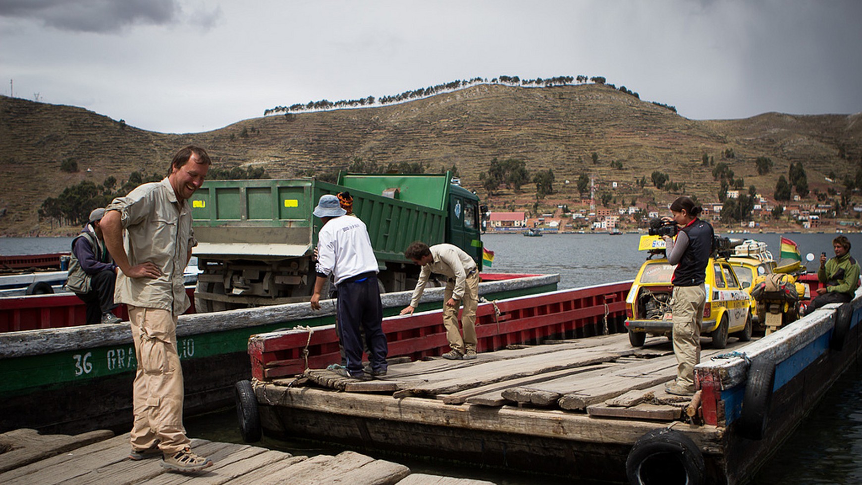 Lekcja kooperacjiPierwsze minuty na granicy boliwijskiej przyniosły nowe, nieznane dotąd problemy. Nie byliśmy wyposażeni w boliwijskie ubezpieczenie komunikacyjne, bo takowe chcieliśmy wykupić jak to się to zazwyczaj robi - na granicy. Zazwyczaj. Uprzejmi policjanci zapewne bardzo chętnie by nam pomogli gdyby takowe mieli, ale na najbardziej popularnym wśród turystów punkcie kontroli granicznej w Boliwii takiego ubezpieczenia zakupić nie można - tak twierdzili. Mogliby nas jednak nauczyć, i to w miarę niedrogo, bardzo cennej umiejętności - kooperacji. Kooperacja polega na tym, że w uznaniu za niewielki grant finansowy przychylni Boliwijczycy pomagają nam rozwiązywać różne błahe lub mniej błahe problemy. Mundurowi lekcji kooperacji udzielili nam ze zniżką, a my z odpowiednimi pieczątkami ruszyliśmy przed siebie. Od razu zrobiło się jasne z jakim typem państwa mamy do czynienia - w Boliwii panuje spora samowolka w każdej sferze życia publicznego, administracji czy handlu. Politycznie Boliwia obrała kurs rewolucyjny i stąd wynikają nasze różne problemy ze zrozumieniem bądź akceptacja panujących tu zasad. Szybko dostrzegliśmy jednak, że nie wszystkie ale te najdurniejsze i irracjonalne procedury państwowe wzbudzają wśród Boliwijczyków respekt i jak na złość tych właśnie procedur lokalni przestrzegają nadzwyczaj ochoczo. W Boliwii to nie drogi, choć fatalne, ale podwójne standardy, specjalna dla gringosów cena benzyny oraz ustawiczne i błyskawiczne zmiany cen najprostszych towarów w lokalnych sklepach najbardziej dały się nam we znaki. Ciężar na drewnianych barkachCieśninę Tiquina na jeziorze Titicaca przekracza się barką - to jedyne 850 m, które trzeba przebyć aby dotrzeć na drugi brzeg. Drewniane barki nie wzbudzały zaufania. Rozchwierutane, dziurawe, przygnite, drewniane tratwy na nasz gust nie powinny przewozić nawet boliwijskich baranów. Właśnie dlatego nie podobało nam się to czego dopuszczają się przewoźnicy. Dość prędko - przed załadunkiem - doszło do ostrej wymiany zdań. Broniliśmy zasad zdrowego rozsądku oni natomiast swoich procedur. Napisali bowiem urzędnicy biednym Boliwijczykom, że na barkę można załadować ni mniej ni więcej ale 2 auta. Dlatego też biedni Boliwijczycy za wszelka cenę chcieli dokooptować jeszcze jedno - nasze auto na barkę, gdzie stała już 10-tonowa ciężarówka, ale za nic w świecie nie wpuścili trzech małych samochodów na dużą pustą barkę czekającą obok. Cała sytuacja wydała się absurdalna z punktu widzenia Europejczyka, ale wiatr ma tutaj zapach socjalizmu - należy się nim delektować, a nie doszukiwać problemów. Będzie to autentyczne, dobre do filmu - stwierdziliśmy i ostatecznie celowo zaparkowaliśmy trabanta za wielka ciężarówką, a z pokładu drugiej rozchwierutanej barki wycelowaliśmy obiektywy kamer na tą pierwszą - przeładowaną. To już nie pierwszy raz hasłem "dobre do filmu" tlumaczymy sobie nasze uczestnictwo w takich dziwnych sytuacjach. Niechlujnie porozrzucane deski pokładu nie tworzyły nawet zwartej powierzchni. Jeden z trabantów wpadł kołem do środka barki. Cała przeprawa zakończyła się ponowną wielką awantura, tyle ze na drugim brzegu.- Nie zdążyliśmy się zreflektować i zaproponować kooperacji na czas, a Boliwijczycy zrobili tak jak im nakazują procedury. Kierowca barki poskąpił odszkodowania za porysowanego trabanta i otrzymał od nas zapłatę za kurs i to z małym napiwkiem na nowe deski. Dla niego ta sytuacja to przecież chleb powszedni. autor: Tomasz Turchan