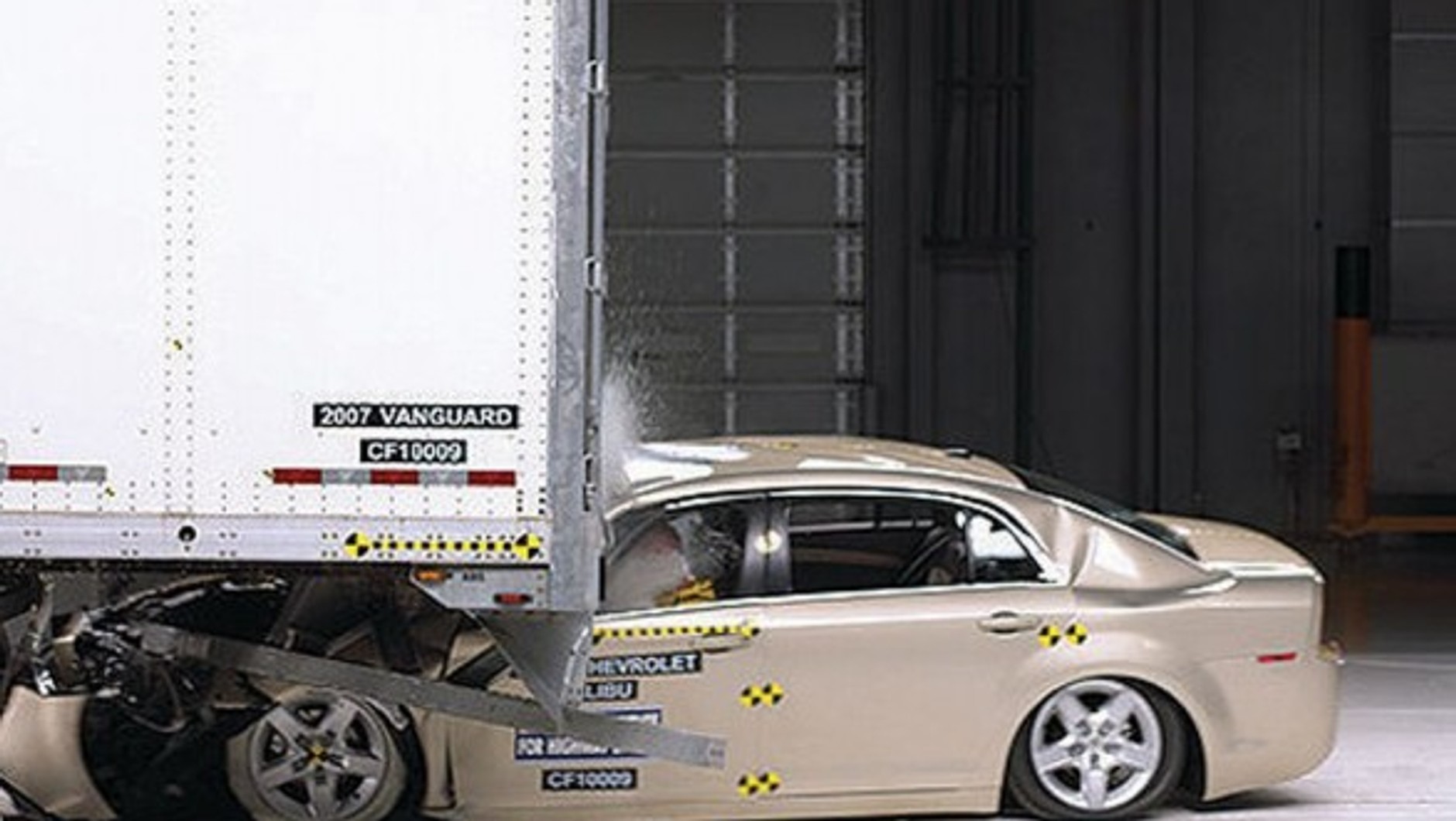 Pasażerowie Chevroleta Malibu w wyniku najechania na tył ciężarówki z prędkością 56 km/h nie mieliby jakichkolwiek szans przeżycia.Specjaliści IIHS apelują do producentów o stosowanie rozwiązań uniemożliwiających „wjechanie” osobówki pod tył auta ciężarowego.