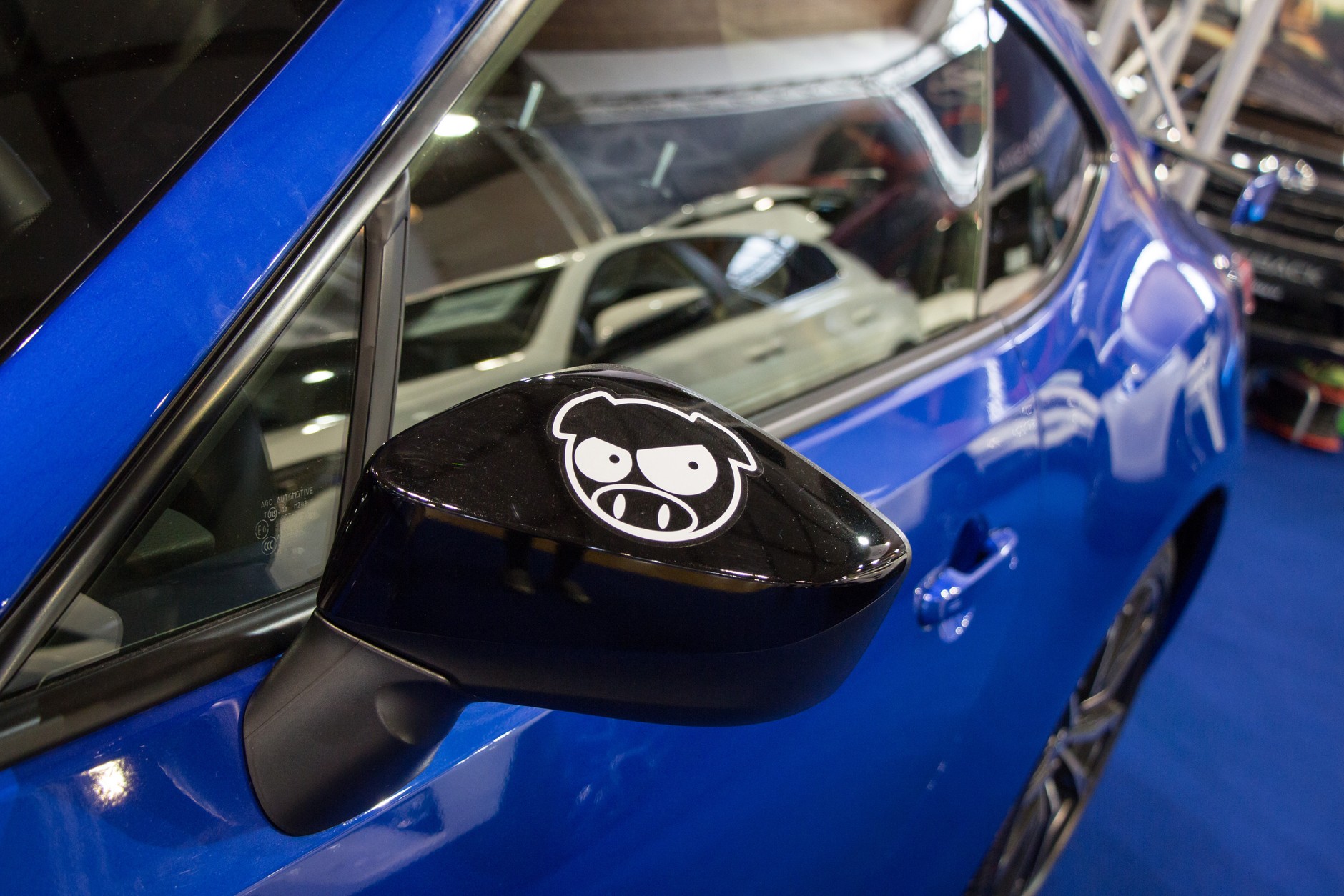 Nie zawsze naklejka znajduje się z tyłu samochodu. Czasem możemy zobaczyć ją na tylnej części lusterka. Charakterystyczną świnkę naklejają sobie kierowcy samochodów jednej marki — Subaru.
