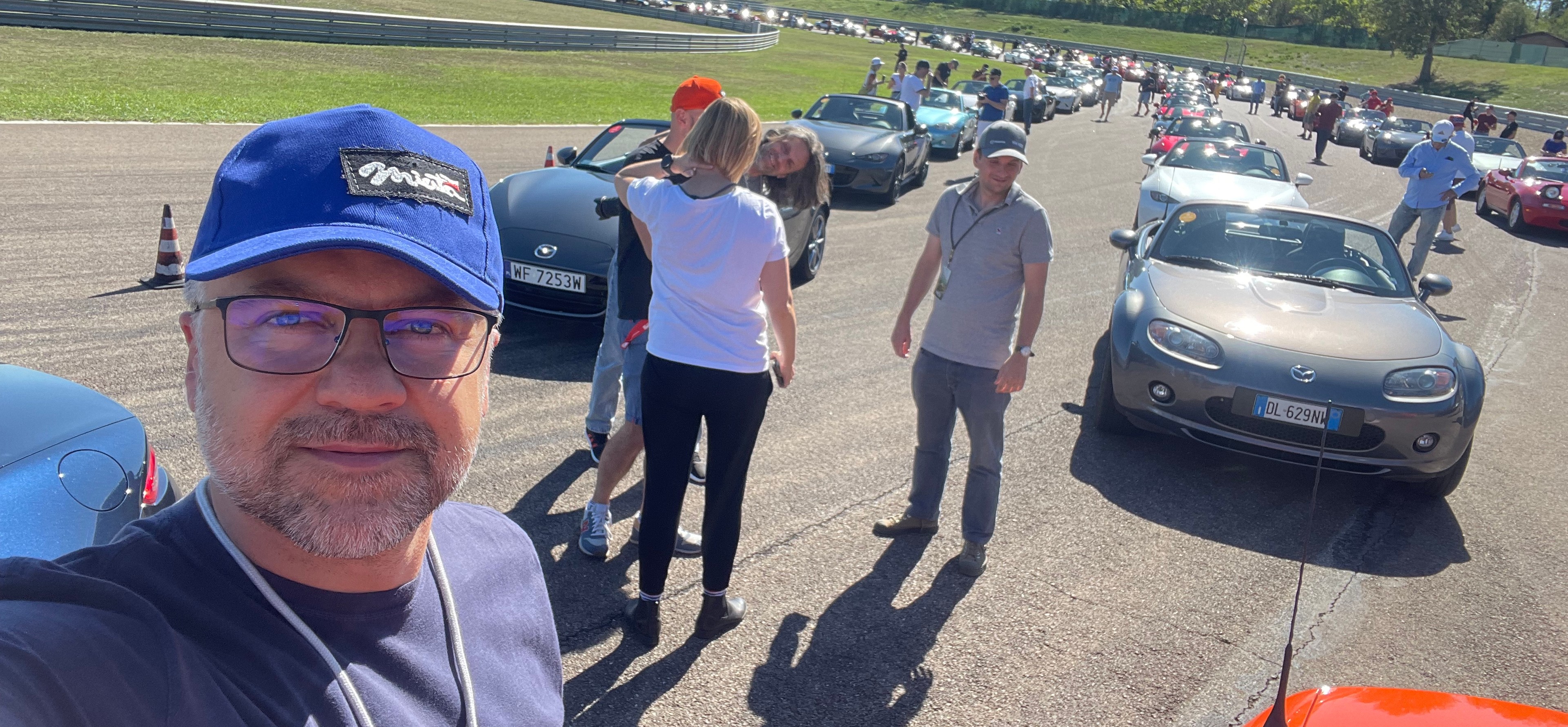 Niedziela 18 września przywitała nas błękitnym, bezchmurnym niebem. Na trasie z Maranello do Autodromo di Modena zagęszczenie Mazd MX-5 zwiększało się systematycznie, by w okolicach toru osiągnąć niemal masę krytyczną. Dziesiątki tych aut w różnych odsłonach, generacjach, jak i kondycji łączyły uśmiechnięte załogi. Poczucie, że bierzemy udział w czymś szczególnym, jeszcze bardziej wzmacniało satysfakcję, że udało nam się tu dotrzeć. Obsługa imprezy uwijała się dzielnie i w sumie ponad 700 samochodów, które dojechały do Modeny, dość szybko znalazło swoje miejsca na wyznaczonym parkingu.