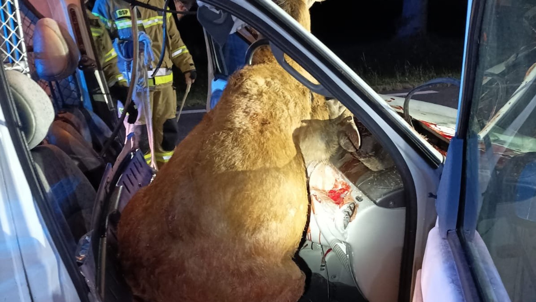 Strażacy poinformowali, że ratownicy pomogli wydostać się zwierzęciu z pojazdu, a następnie przekazali je odpowiednim służbom. Jak przekazała Wirtualna Polska, lekarz weterynarii zdecydował o uśpieniu jelenia. Żadnych obrażeń nie odniósł natomiast jadący Renault 24-latek.