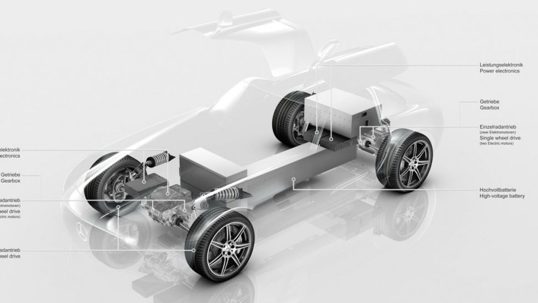 Elektryczny Gullwing wyposażony zostanie w cztery silniki, które zostaną umieszczone tuż przy każdym z kół. Łącznie będą produkowały moc 525 KM i 880 Nm mom. obr.