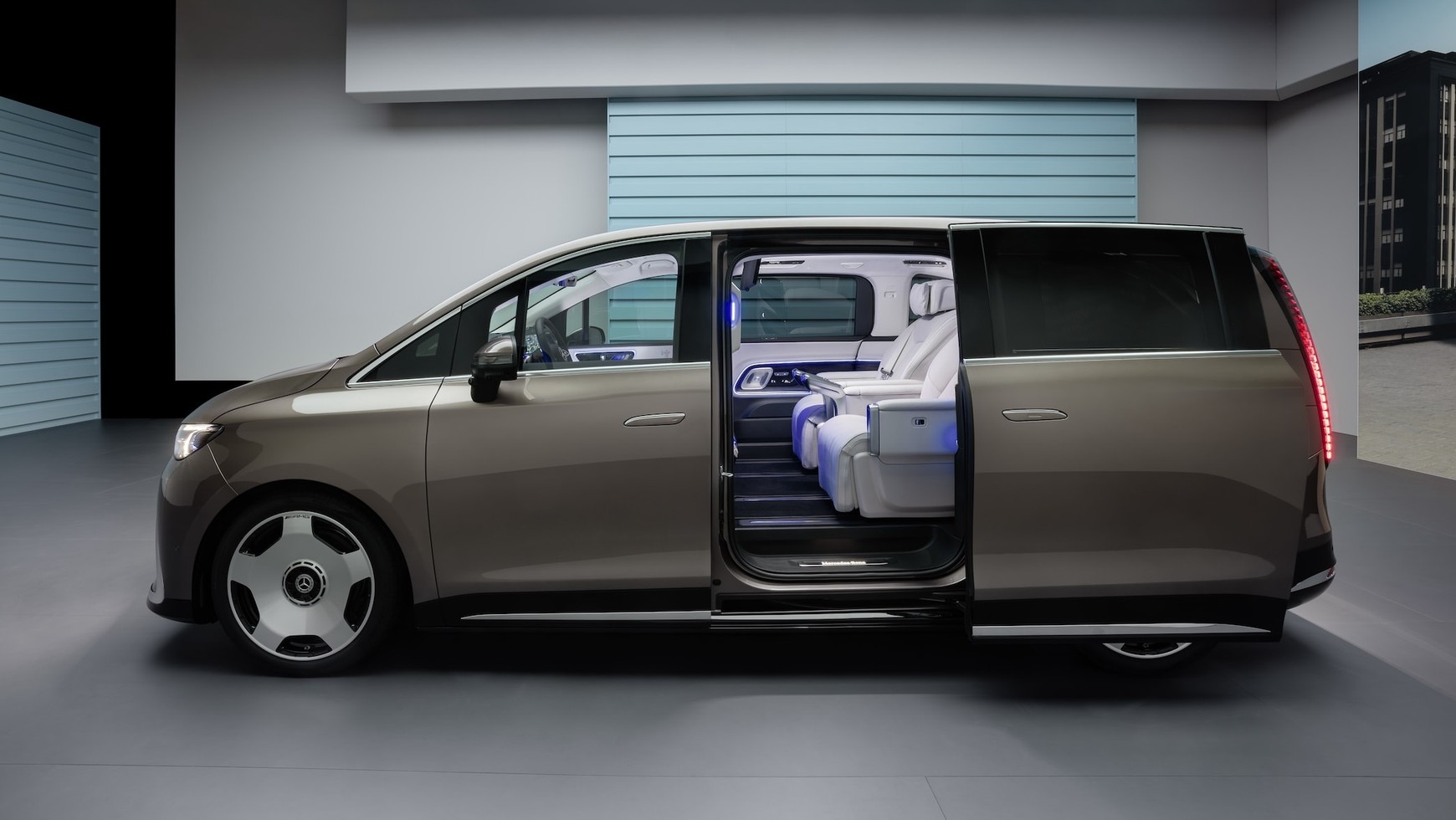 Naturalnie w nadwoziu VLE odnajdziemy wiele nowych motywów stylistycznych, których trzyma się teraz marka ze Stuttgartu. Najjaśniejszym przykładem jest nowy znak rozpoznawczy Mercedesa, czyli ogromny podświetlany grill. Nad nim znajdziecie listwę świetlną łączącą reflektory, w których nie zabrakło świateł do jazdy dziennej w kształcie gwiazdy. Co ważne, na masce jest klasyczna stojąca gwiazda — uff, jednak są jeszcze jakieś świętości! Tył jest bardzo prosty i podyktowany aerodynamice — ma pionowe lampy połączone spojlerem i funkcję ułatwiającą szybki załadunek, czyli otwieraną szybę w klapie bagażnika.