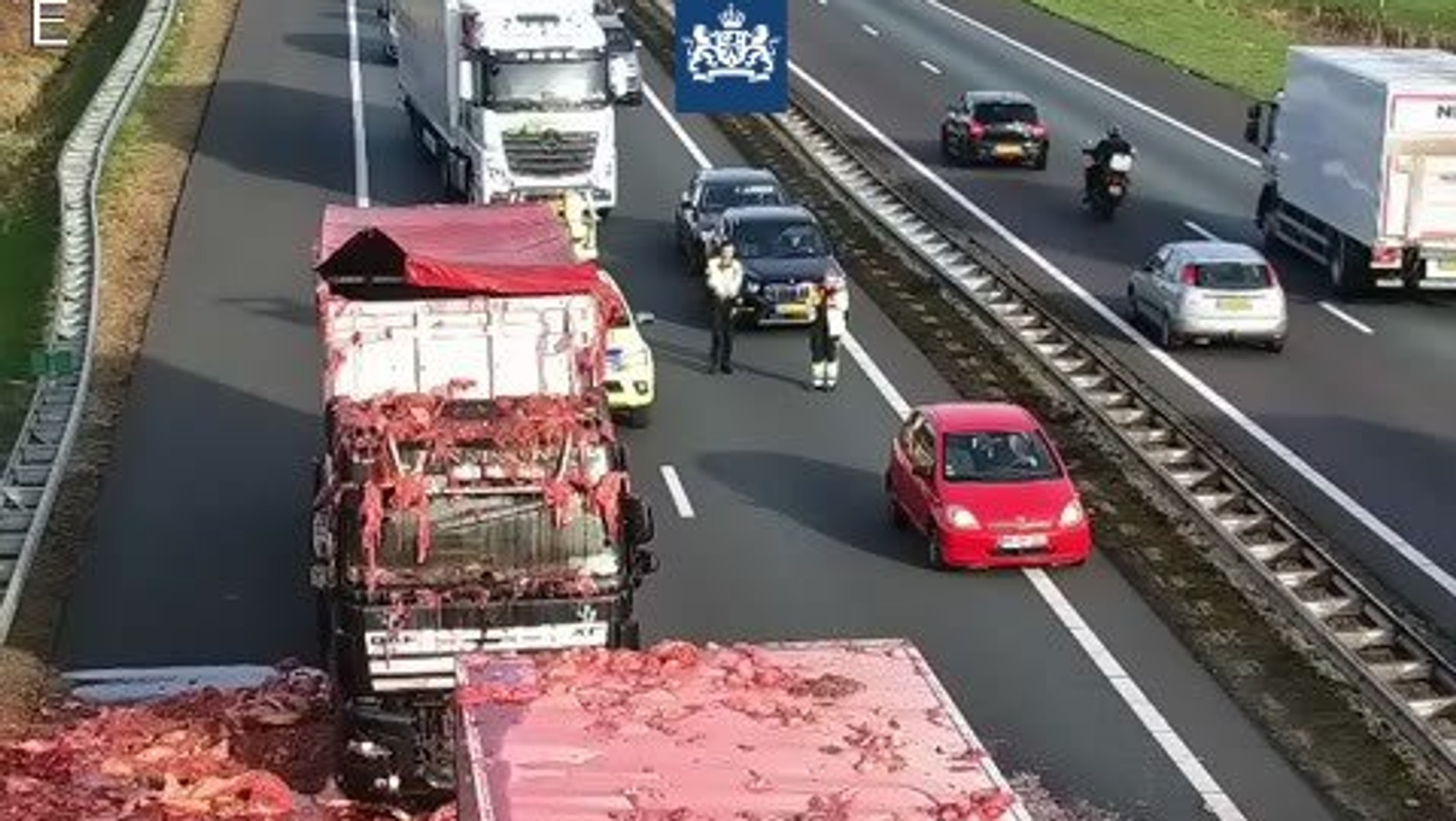 Na autostradzie A67 pomiędzy Venlo a Eindhoven w Holandii, w czwartek 16 marca ok. 16:45 zdarzył się bardzo nietypowy incydent. Uczestnicząca w nim ciężarówka dosłownie została zasypana odpadami rzeźniczymi. Znalazły się one także na jezdni.