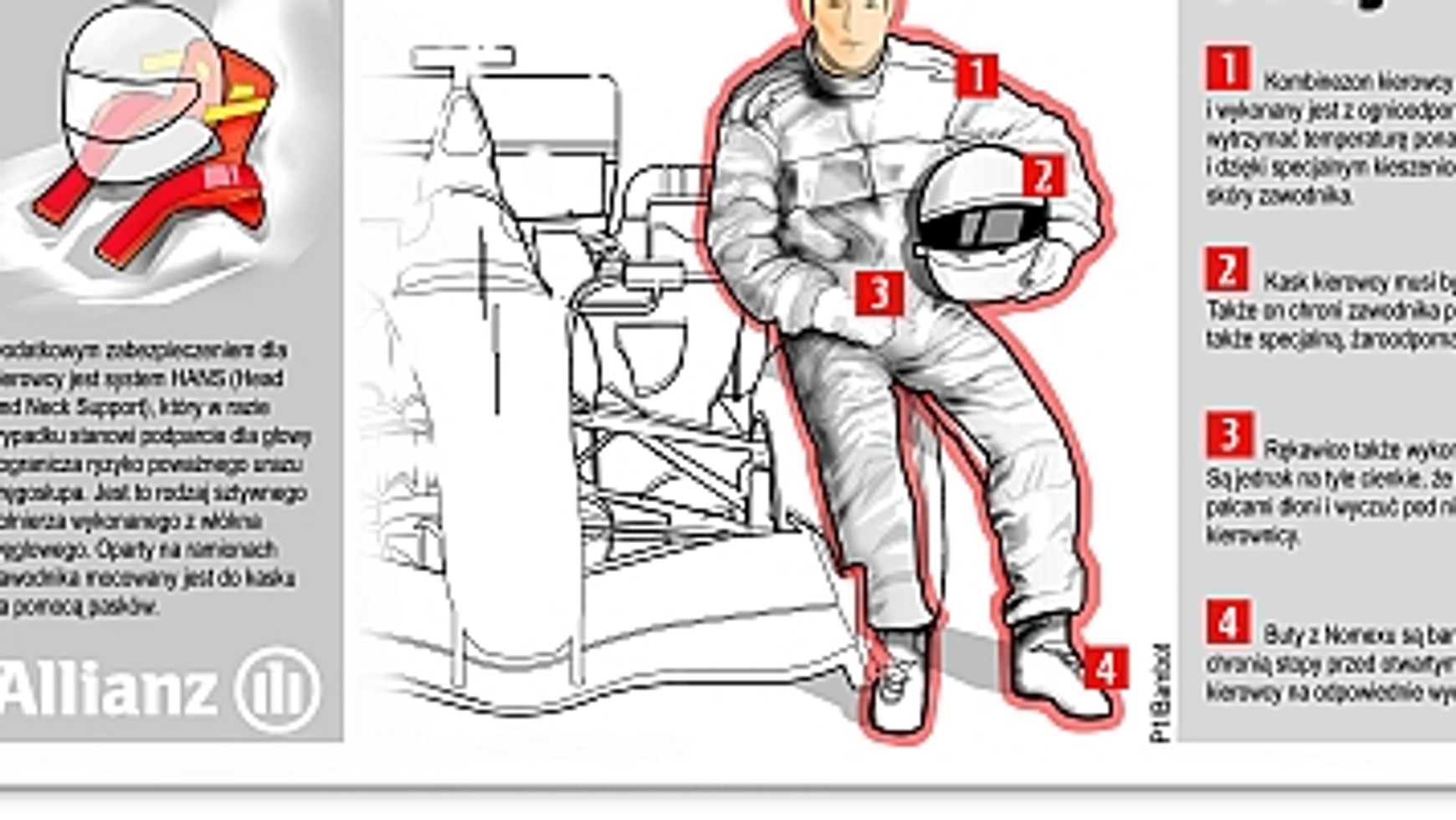 Jeszcze w latach 70-tych wykonywano je z łatwopalnej bawełny, lecz po słynnym wypadku Nikiego Laudy na starym Nurburgringu kwestia zabezpieczenia zawodników przed ogniem wyszła na pierwszy plan.Od tamtej pory strój zawodników F1 zmienił się diametralnie. Obecnie najważniejszym materiałem zabezpieczającym skórę kierowcy przed płomieniami jest Nomex. Z włókien aramidowych wykonuje się również rękawiczki, kominiarkę, buty oraz bieliznę. Chronią one nie tylko przed otwartym ogniem, lecz także toksycznymi gazami oraz kwasem. Kolejną zaletą Nomexu jest jego niska masa. Trzywarstwowy kombinezon waży zaledwie 1.9 kilograma. Strój zawodnika Formuły 1 kosztuje około 1200 euro. Kombinezon musi być idealnie dopasowany do ciała kierowcy, ponieważ od tego zależy bezpieczeństwo oraz komfort. Podczas szybkiej jazdy zawodnik powinien być skoncentrowany wyłącznie na prowadzeniu samochodu, a nie uwierającym szwie. Podobne kombinezony noszą wszyscy mechanicy zatrudnieni przy obsłudze samochodu w trakcie wyścigu. Wysokociśnieniowe systemy tankujące czasami zawodzą, więc ryzyko poparzenia ekipy serwisowej także jest wysokie. Ostatnio pokazał to drobny pożar na bolidzie Felipe Massy po tankowaniu w trakcie Grand Prix Hiszpanii.Aby upewnić się, że kombinezon nie będzie krępował ruchów prowadzącego wokół ramion wszywa się rozciągliwy materiał. Warstwa wewnętrzna pozbawiona jest szwów, dzięki czemu cały strój jest niezwykle wygodny. Ponadto materiał "oddycha", zapewniając lepszą wentylację ciała. To niezwykle ważne, szczególnie w trakcie najgorętszych, wilgotnych wyścigów. Podczas Grand Prix Malezji temperatura w kokpicie przekracza 50 stopni!Kombinezony przechodzą rygorystyczne próby wytrzymałości zanim uzyskają atest Międzynarodowej Federacji Samochodowej (FIA). Podczas testów wystawiane są przez dziesięć sekund na działanie płomienia o temperaturze 820 stopni. Sprawdzana jest nawet jego wytrzymałość na pranie oraz chemiczne czyszczenie. Tu nie ma miejsca na błąd. Zawodnik musi być w stanie przeżyć 35 sekund w temperaturze 840 stopni! W trakcie całego sezonu, w wyścigach i testach jeden kierowca zużywa około 16 kompletów specjalnego ubrania. Każdy zespół na jeden wyścig zabiera dla swoich zawodników po trzy kombinezony. Potem służbowe stroje oddawane są do pralni, a po "odsłużeniu" docelowego przebiegu "idą" do szafy, na wystawę lub... aukcję. źródło: Allianz