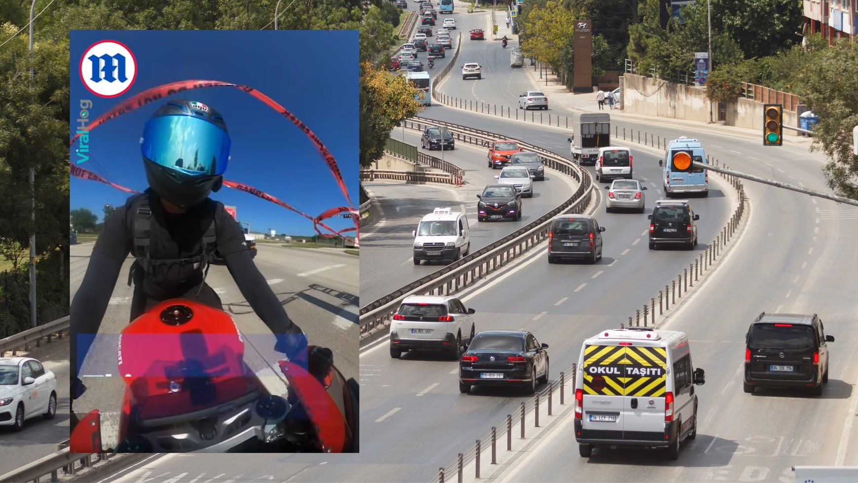 W nagraniu oczekujący na rozładowanie korka i zmianę świateł motocyklista, który nagrał materiał, niemal nie stracił głowy, gdy porwana wiatrem taśma bagażowa z sąsiadującej z nim furgonetki nie oplotła go i zaczęła ciągnąć w przód motocykla. Mężczyzna zachował jednak zimną krew i na czas wyplątał się z taśmy, dzięki czemu nie stracił równowagi i nie poniósł żadnych obrażeń.