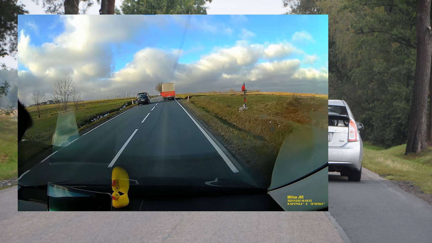 Na nagraniu widać, jak kierowca jedzie za ciężarówką, a z naprzeciwka przejeżdżają samochody. W pewnym momencie jednak powstaje luka, którą postanawia wykorzystać prowadzący vana marki Renault. Zaczyna wyprzedzać. Robi to jednak bardzo wolno, z niewielką różnicą prędkości, co powoduje, że z naprzeciwka zdążył nadjechać inny samochód. Wtedy kierowa czarnego Renault, zamiast zjechać na swój pas, hamuje i zatrzymuje się przed autem jadącym z naprzeciwka.