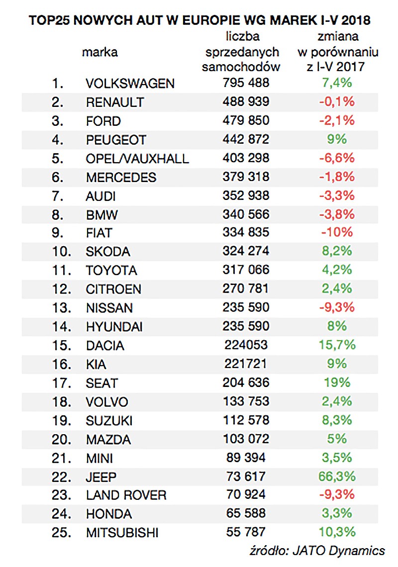 Wśród marek Volkswagen, jest – obok Peugeota i Skody – w trójce marek, które zanotowały wzrost liczby rejestracji nowych aut. Rekordy nadal bije Jeep, w okresie I-V 2018 zarejestrowano o 2/3 aut tej marki więcej niż rok temu. Warto zauważyć także dwucyfrowe wzrosty Dacii i Mitsubishi.