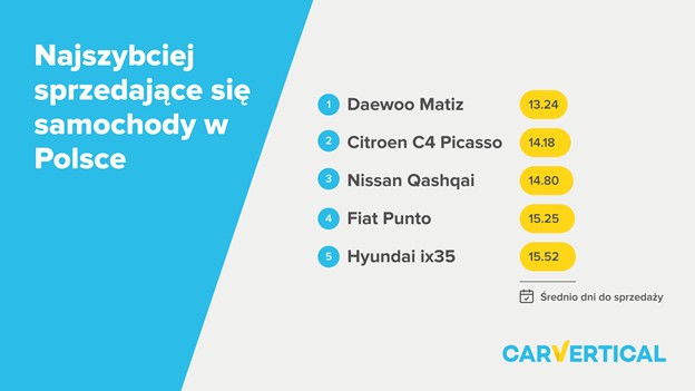 Pierwsze miejsce w zestawieniu może być dla wielu osób zaskoczeniem. Najszybciej sprzedającym się samochodem w Polsce jest Daewoo Matiz. Jest to także jedyne auto, które na nabywcę czeka mniej niż dwa tygodnie. CarVertical podaje możliwe powody takiej sytuacji, "to przede wszystkim stare, proste i przeważnie już mocno podrdzewiałe auto, więc cena jest niska". Model ten wybierany jest także szczególnie chętnie przez mieszkańców mniejszych miejscowości, którzy szukają taniego samochodu, który zastąpić ma komunikację zbiorową. Jest to także samochód wybierany do sporadycznego użytku, a kierowców tego typu, jak sugeruje carVertical, jest wielu.