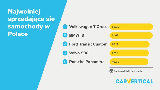 Na drugim końcu rankingu - czyli najdłużej czeka na nabywcę - znajduje się Volkswagen T-Cross. W tym przypadku na kolejnego właściciela czeka aż 52 dni. Niewiele szybciej sprzedaje się BMW i3. Trzeci wśród samochodów, które najdłużej czekają na nabywcę jest Ford Transit Custom. Czwarte - Volvo S90. Pierwszą piątkę zamyka Porsche Panamera, które na następnego właściciela czeka przeciętnie ponad 46 dni.