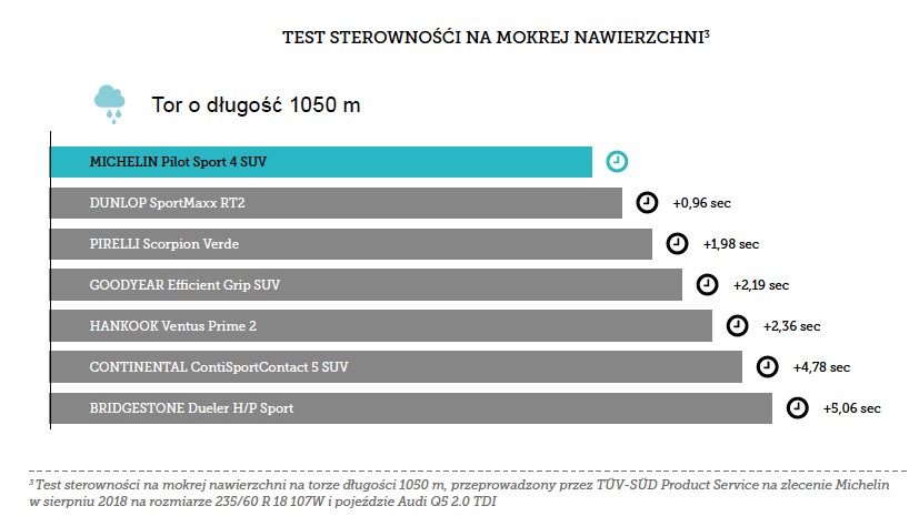 Michelin Pilot Sport 4 SUV gwarantuje ponadto wysoki poziom kontroli i precyzji, czyli szybkiej reakcji na polecenia wydawane przez kierowcę, co dodatkowo poprawia przyjemność z prowadzenia. Przekłada się to także na lepsze wyniki okrążeń podczas prób sportowych oraz szybszą, sprawniejszą jazdę po normalnych drogach.