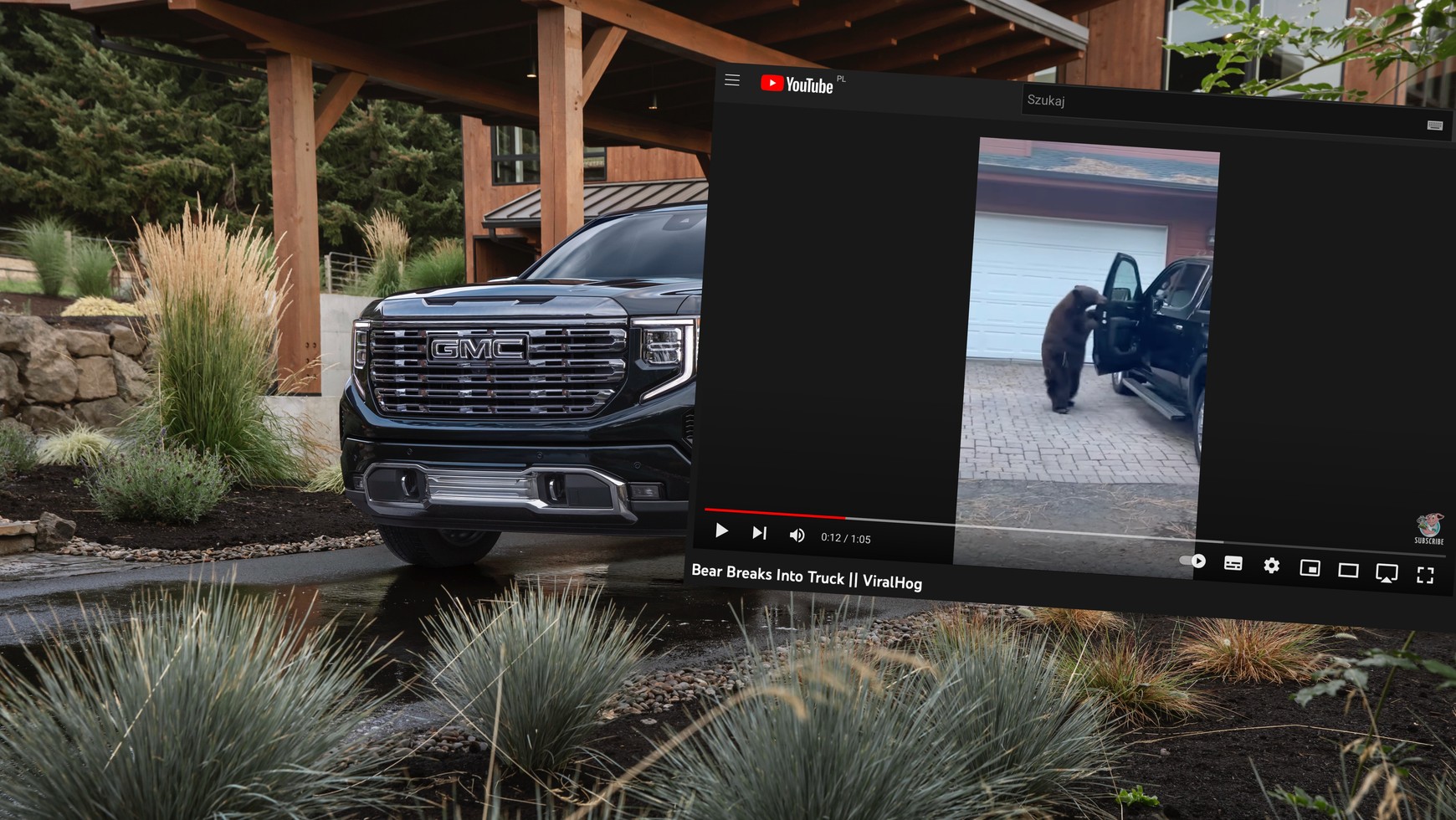 Na filmie nakręconym z samochodu przejeżdżającego obok podjazdu, na którym zaparkowany jest GMC Sierra Denali, widać, jak do auta zbliża się niedźwiedź. Po obwąchaniu pojazdu zwierzę staje na tylnych łapach i w niemal naturalny sposób pociąga za klamkę i otwiera drzwi, a następnie wspina się do kabiny, jak do swojego własnego samochodu.