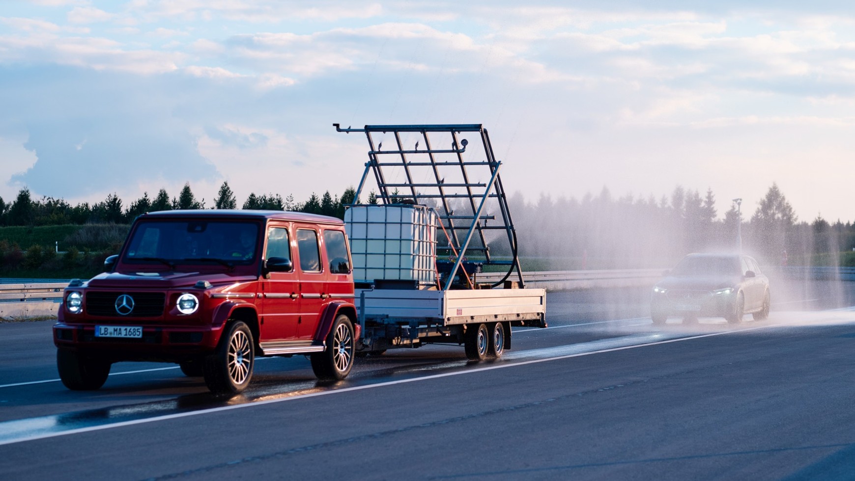 Chcesz zainscenizować oślepienie kierowcy? Proszę bardzo, wówczas w ruch pójdzie ultrasilna lampa LED — tak mocna, że można byłoby ją wykorzystać do badań głębinowych na morzu. Tutaj jest słońcem wykorzystywanym do testowania kamer rozpoznających przeszkody na drodze. Mercedes opatentował też sztuczny deszcz generowany z 1000-litrowego baniaka umieszczonego na przyczepie ciągniętej przez Klasę G. Może być tak intensywny, jak podczas najsilniejszych opadów zarejestrowanych kiedykolwiek przez stację meteorologiczną.