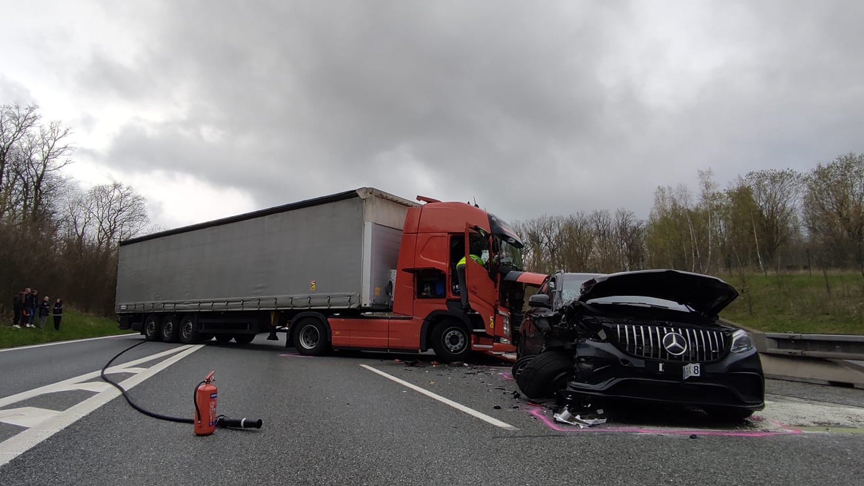 Taka forma blokady zapewne miała skłonić kierowcę Mercedesa do zatrzymania się. Ten jednak usiłował przejechać wąskim miejscem, pozostawionym pomiędzy ciągnikiem a betonową barierą. Przejechać się udało, ale w wyniku tego uszkodził on mocno nie tylko "swoje" auto, lecz także ciężarówkę.
