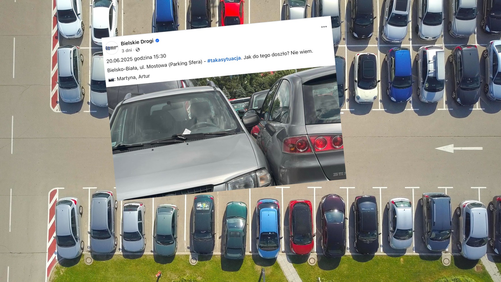 Zdjęcie opublikowano na profilu "Bielskie drogi" na Facebooku z komentarzem: "Jak do tego doszło? Nie wiem". Świadkowie zauważyli tak mocno "przytulone" do siebie samochody w piątek 20 czerwca na parkingu przy ul. Mostowej w Bielsku-Białej.
