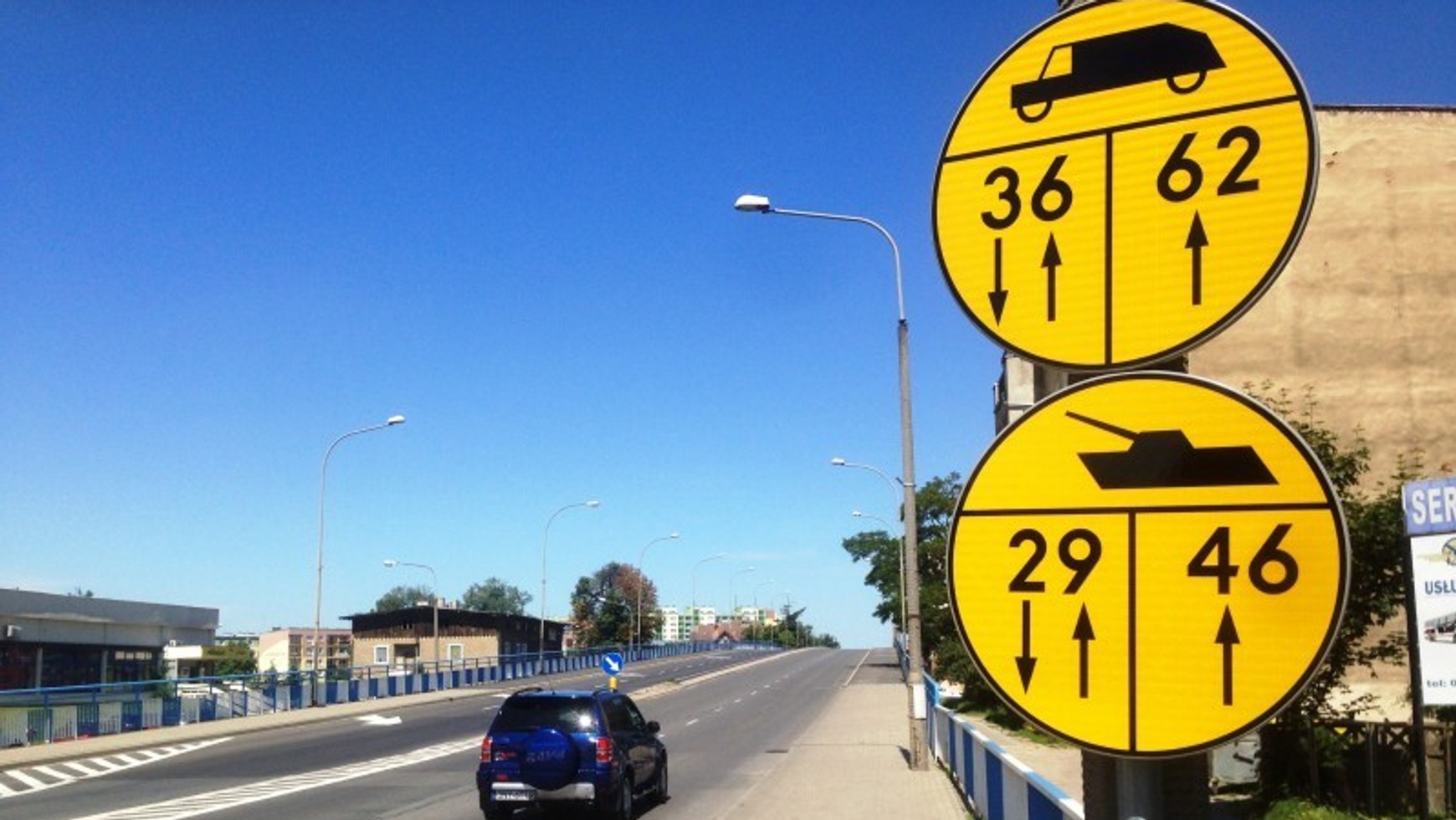Znaki drogowe dla kierujących pojazdami wojskowymi. Od lewej W-4 "klasa obciążenia mostu o ruchu dwukierunkowym dla pojazdów kołowych" i W-5 "klasa obciążenia mostu o ruchu dwukierunkowym dla pojazdów gąsienicowych".