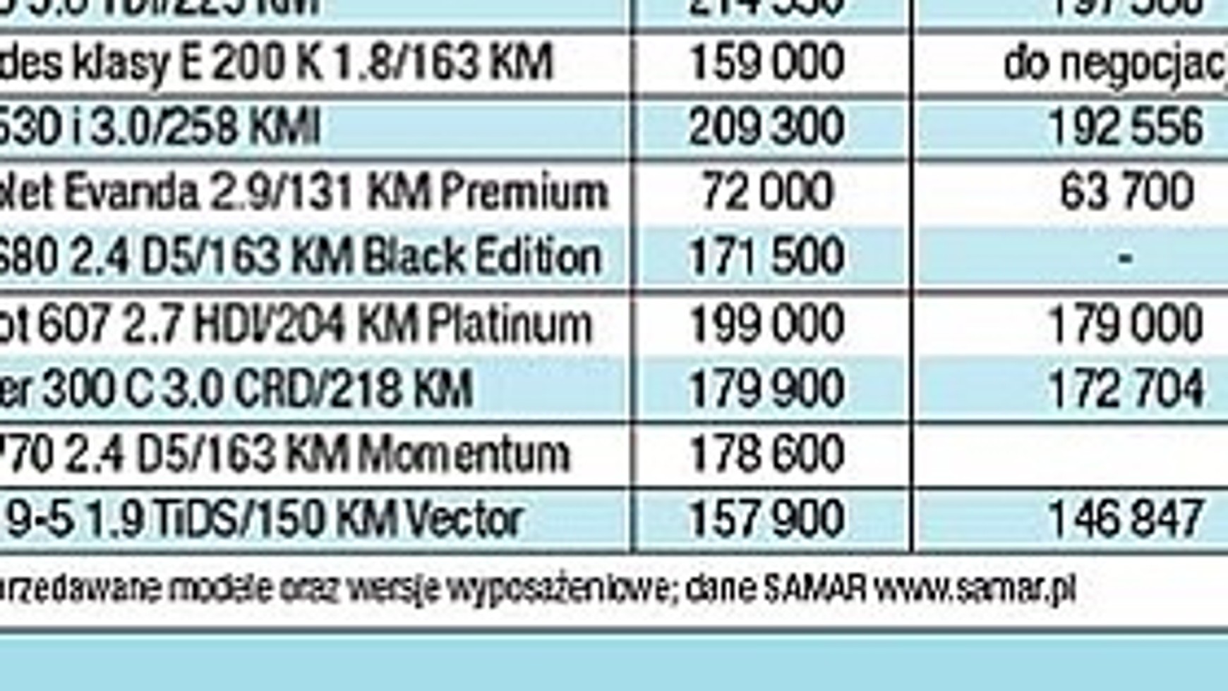 mniej w zestawieniu z rokiem 2004. Udział tego segmentu w rynku wynosi zaledwie 1,4 proc. Średnia cena samochodu wyniosła 167 tys. zł i utrzymała się niemal na identycznym poziomie jak rok wcześniej. Prawie wszystkie modele są objęte promocjami gotówkowymi. Najwięcej zaoszczędzić można, kupując Mercedesa klasy E z roku 2005. Indywidualnie przyznawany upust może sięgnąć 50 tys. zł. Pozostałe są objęte preferencyjnymi warunkami finansowymi (leasing, kredyt czy ubezpieczenie).Liderem segmentu wciąż pozostaje Skoda Superb. W zeszłym roku na ten model zdecydowały się 923 osoby. Na drugiej pozycji uplasowało się Audi A6 (500 samochodów). Mercedes klasy E sprzedał się w ilości 351 sztuk, to aż o 319 sztuk mniej niż w roku 2004. Czwarta pozycja przypadła BMW. Niemcy sprzedali w Polsce 303 ezemplarze modelu serii 5, o 3 proc. więcej niż w analogicznym okresie przed rokiem. Promocje zawarte w tabeli dotyczą samochodów wyprodukowanych w 2005 roku.Więcej: http://www.samar.pl