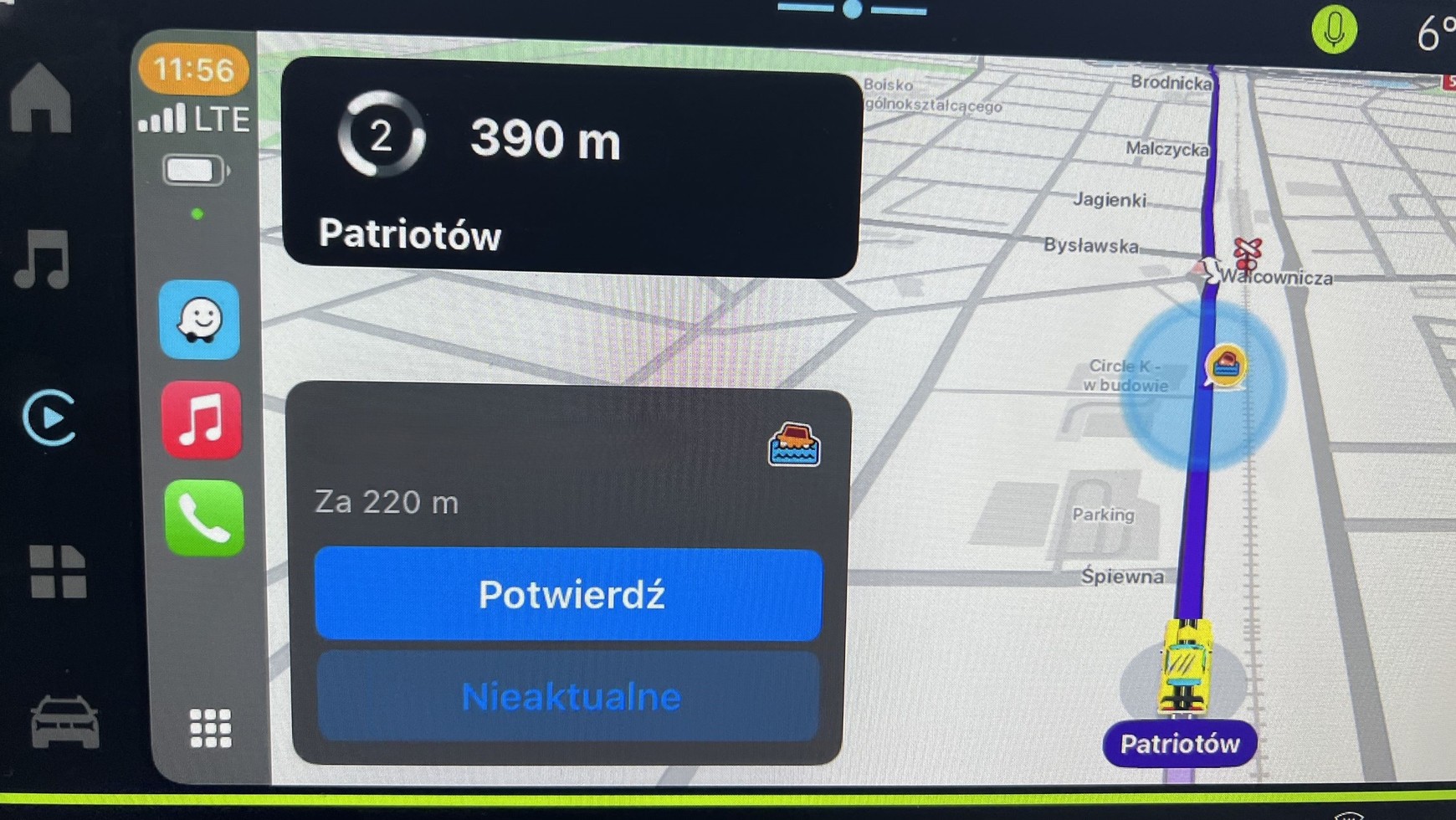 Wiadomo, burze i ulewy to przede wszystkim dużo wody — także na drogach. Dlatego Waze ma nową funkcję, która ostrzega kierowcę, że na jego trasie występuje "zalana droga". W Apple CarPlay wygląda to tak: