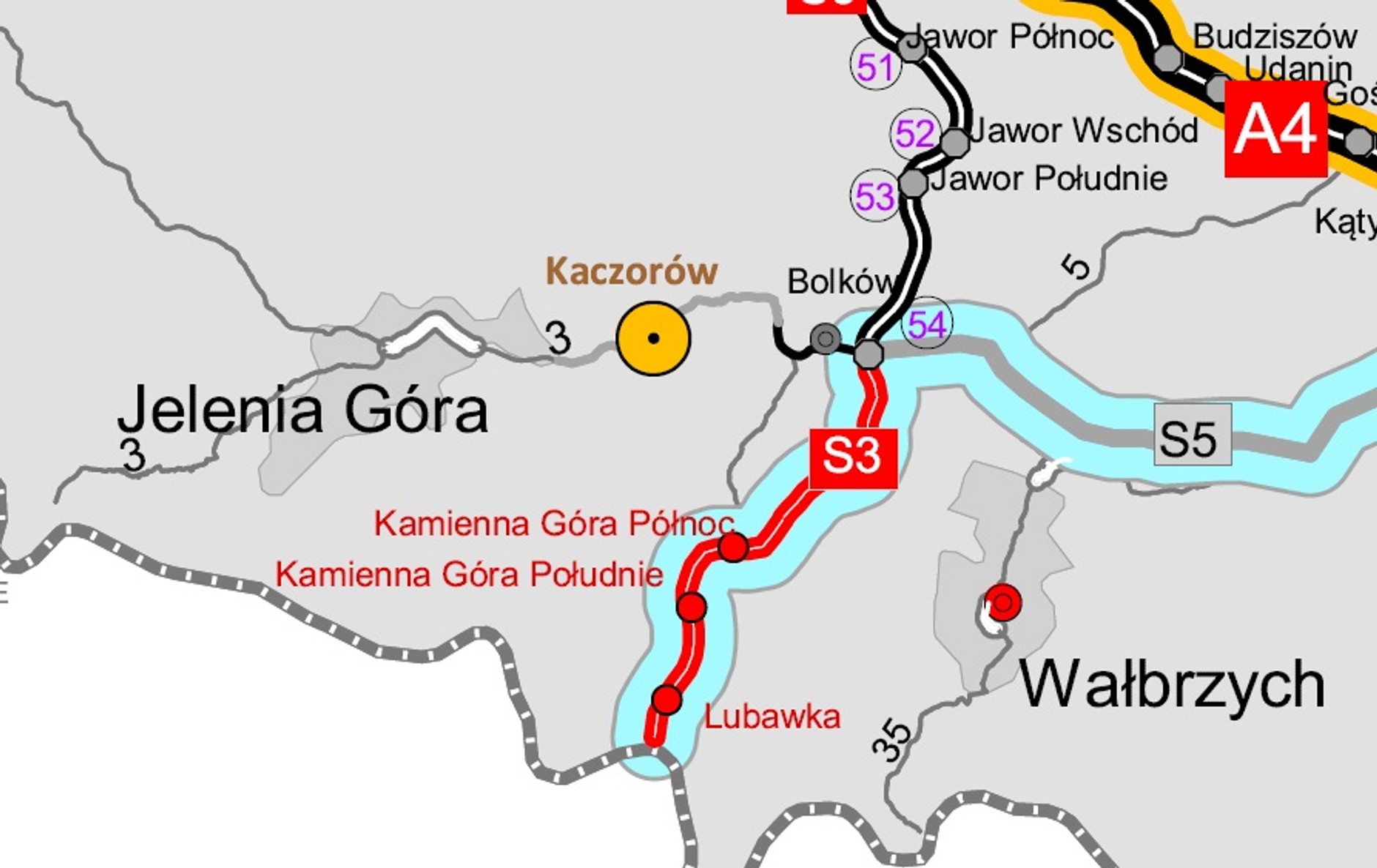 - S3 Kamienna Góra Północ — granica państwa (15,31 km)