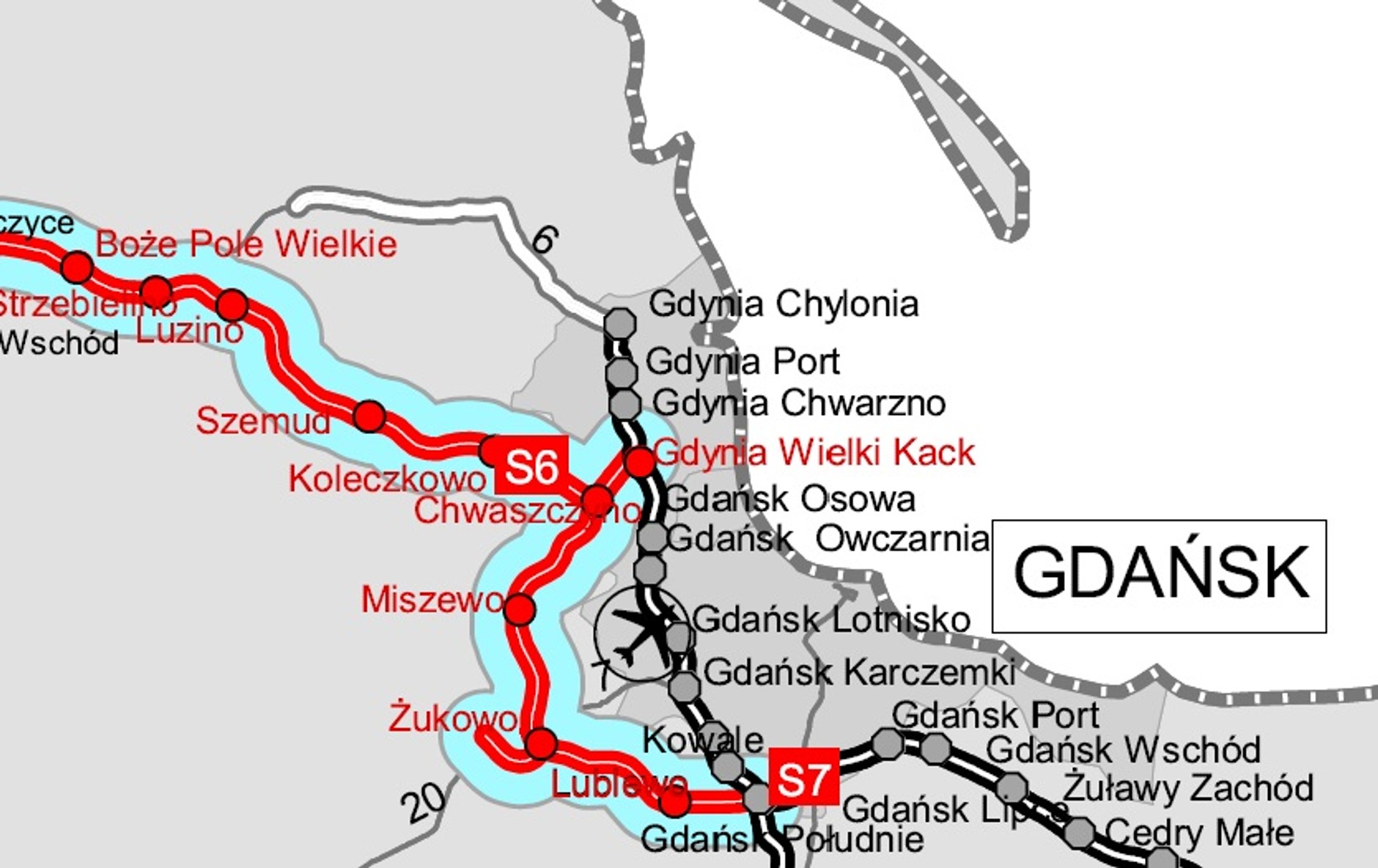 - S6 Szemud – Gdynia Wielki Kack (20,19 km + ok. 2,9 km przebudowy istniejącej Obwodnicy Trójmiasta)