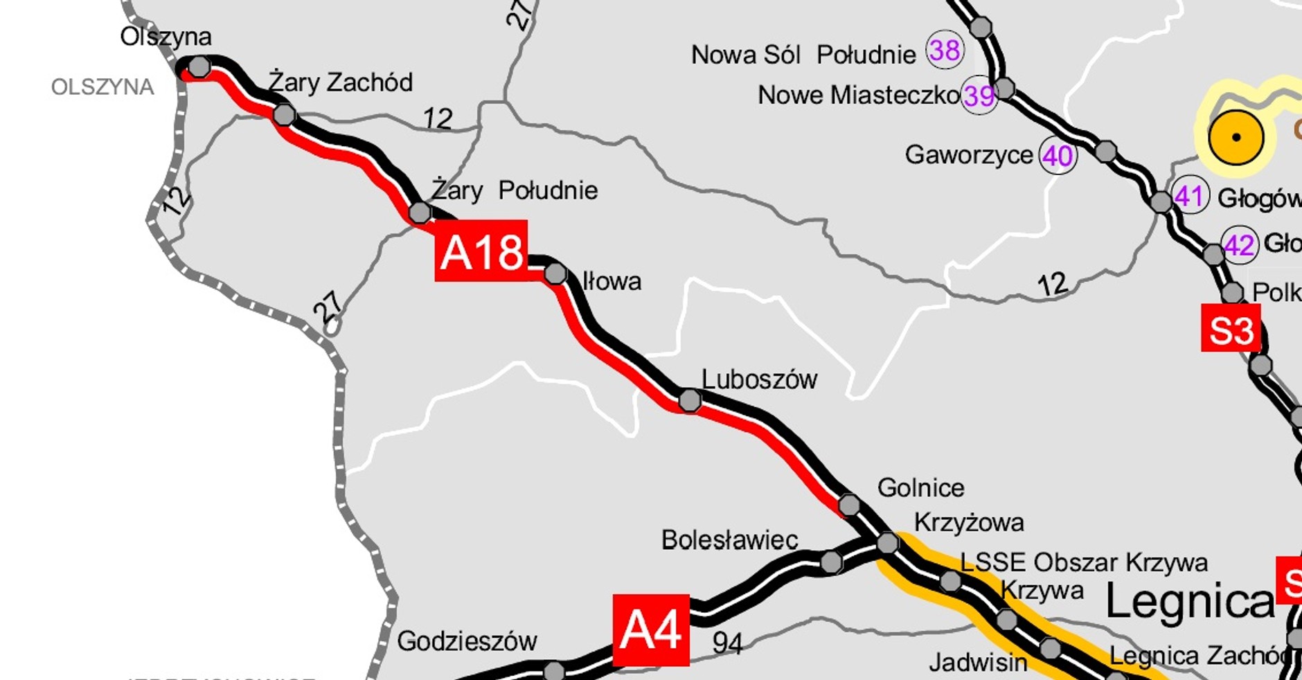 - A18 Olszyna – Golnice (przebudowa jezdni południowej) 21,9 km