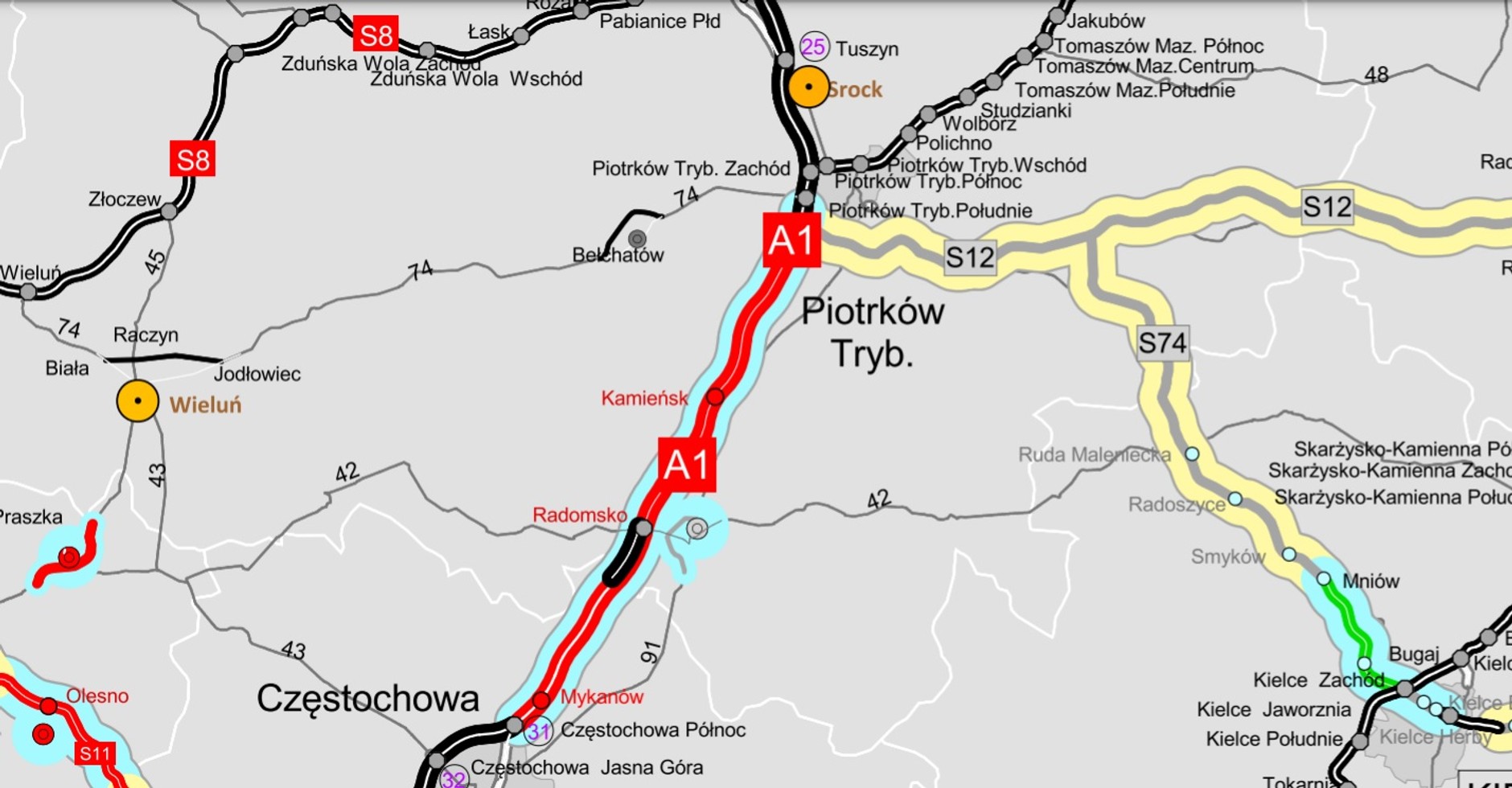 - A1 Piotrków Trybunalski Południe – Kamieńsk (24,2 km) (odcinek jeszcze nieprzejezdny)