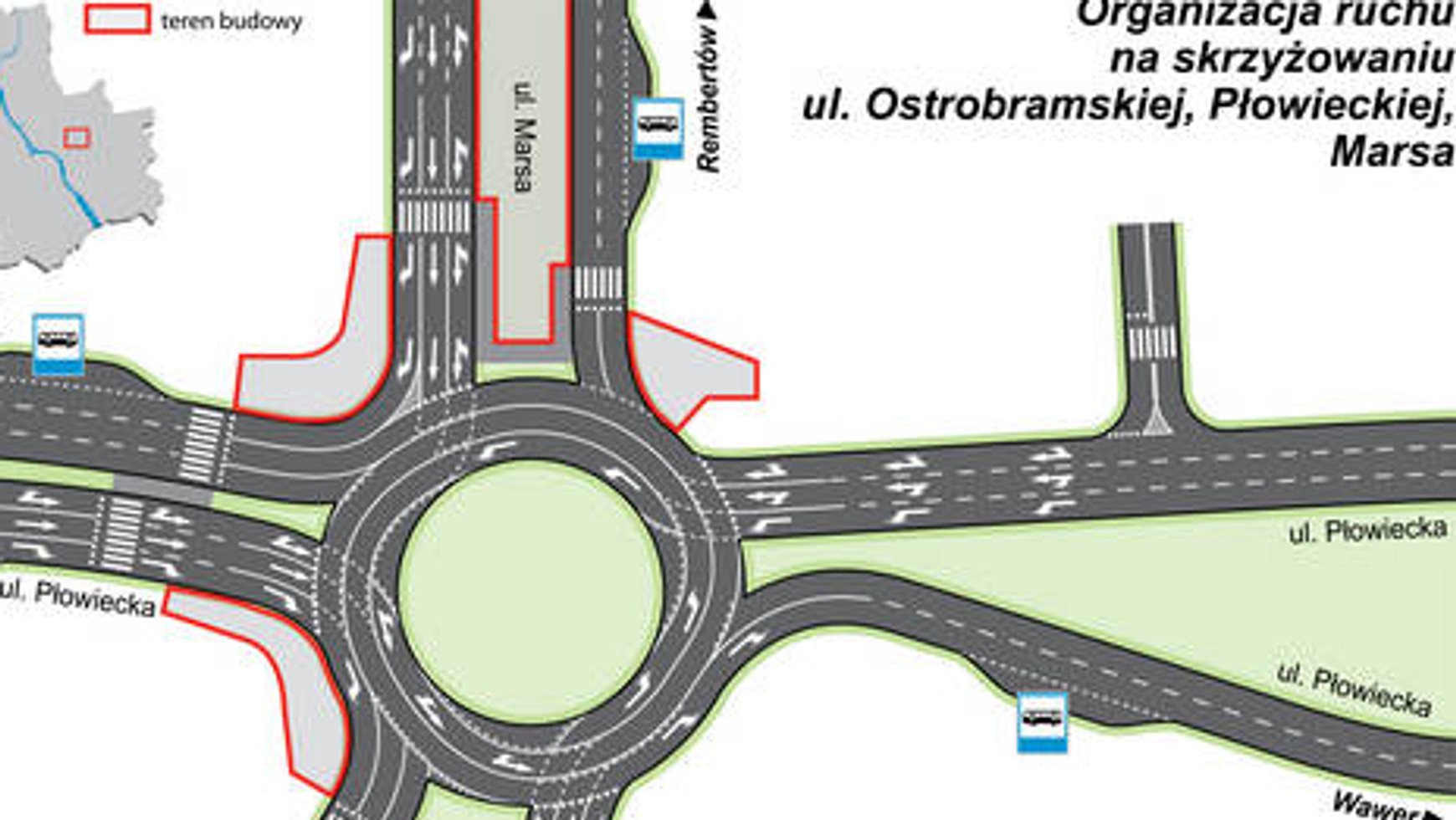 Udostępnienie do ruchu jezdni nowego ronda to jeszcze nie koniec prac przy tym elemencie węzła. Obecnie prowadzone są roboty ziemne w środku ronda. Jego centralna część znajdzie się poniżej poziomu terenu i to z niej promieniście rozchodzić się będą cztery przejścia podziemne, umożliwiając bezpieczne dojście do zlokalizowanych w obrębie ronda przystanków autobusowych.