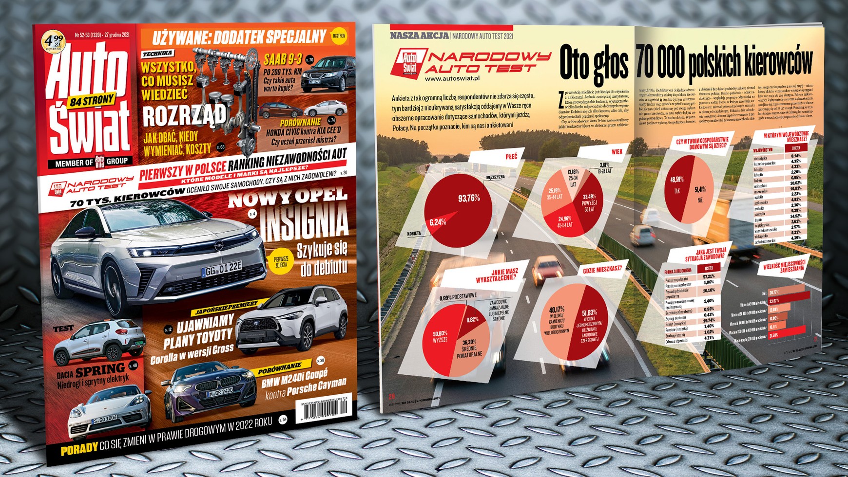 Która samochodowa marka jest w Polsce najbardziej popularna, czy jest to Volkswagen czy może Fiat? Czy Toyota jest naprawdę niezawodna, a francuskie marki bardziej komfortowe od reszty? Czy najchętniej tankujemy na stacjach Orlenu, a ubezpieczamy w PZU? Jakie opony i oleje wybieramy najczęściej i czy serwisujemy w ASO? Odpowiedzi na wszystkie pytania o polską motoryzację AD 2021 uzyskaliśmy dzięki 70. tys. polskich kierowców, którzy wzięli udział w Narodowym Auto Teście Auto Świata i odpowiedzieli na szereg pytań o samochodach, którymi jeżdżą na co dzień. Publikujemy je w nr 52-53 naszego tygodnika, który będzie w sprzedaży od 27 grudnia.