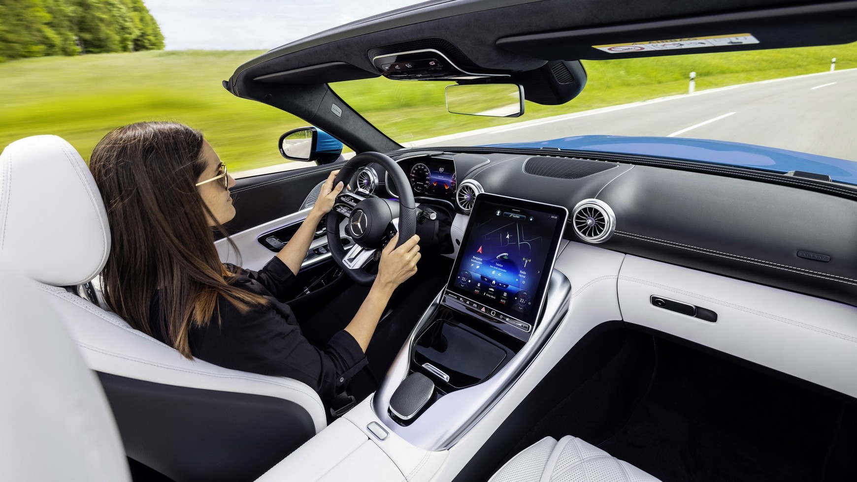 Sam projekt kabiny łączy nowoczesny sport w wydaniu modeli AMG (w końcu SL będzie występował teraz jako Mercedes-AMG) z luksusem na poziomie “eski”. Centralnym punktem na desce rozdzielczej jest ekran systemu MBUX (teraz można go pochylać według uznania), ale w oczy rzucają się też cztery inspirowane lotnictwem okrągłe nawiewy.